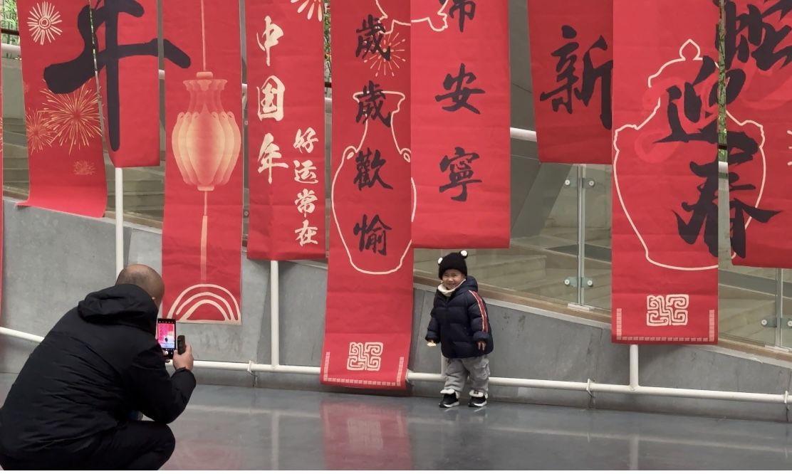 在蚌埠市图书馆,红纸纷飞,墨香四溢,书法家泼墨挥毫、落笔有神,让广大市民在挥毫泼墨间感受书法的无限魅力。二楼大厅精心布置了多组创意春节打卡点,包括“好书福”、“上上签”、“贴对联”、“打年兽”、“压岁钱”等。打卡点以传统的中国红为主色调,搭配黄、绿色系,在传统年味中穿插时尚新春元素。读者在拍照打卡的同时,还能扫码观看节日漫画,解锁那些流传千年的春节习俗背后的趣味故事。