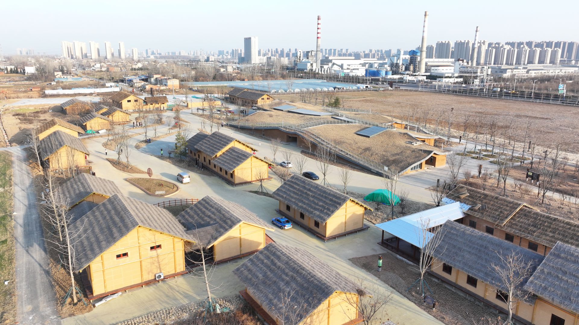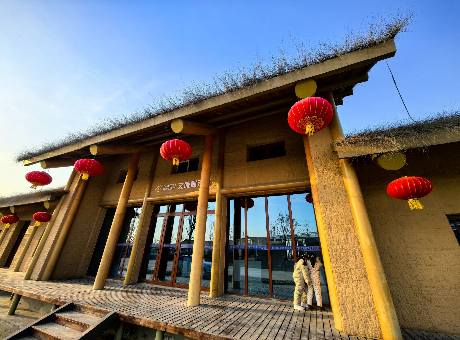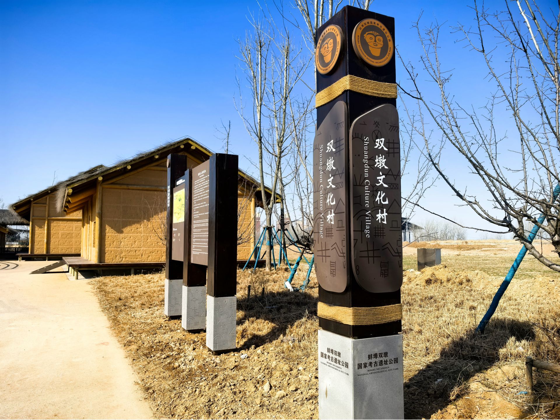 双墩文化村的 13 栋干栏式茅草屋已完成主体施工,这些茅草屋由 29 栋民居改建而来,重焕生机。它们采用砖木结构,外部覆盖土色涂料,顶部用细竹枝屋面代替茅草,既美观又坚固耐用。