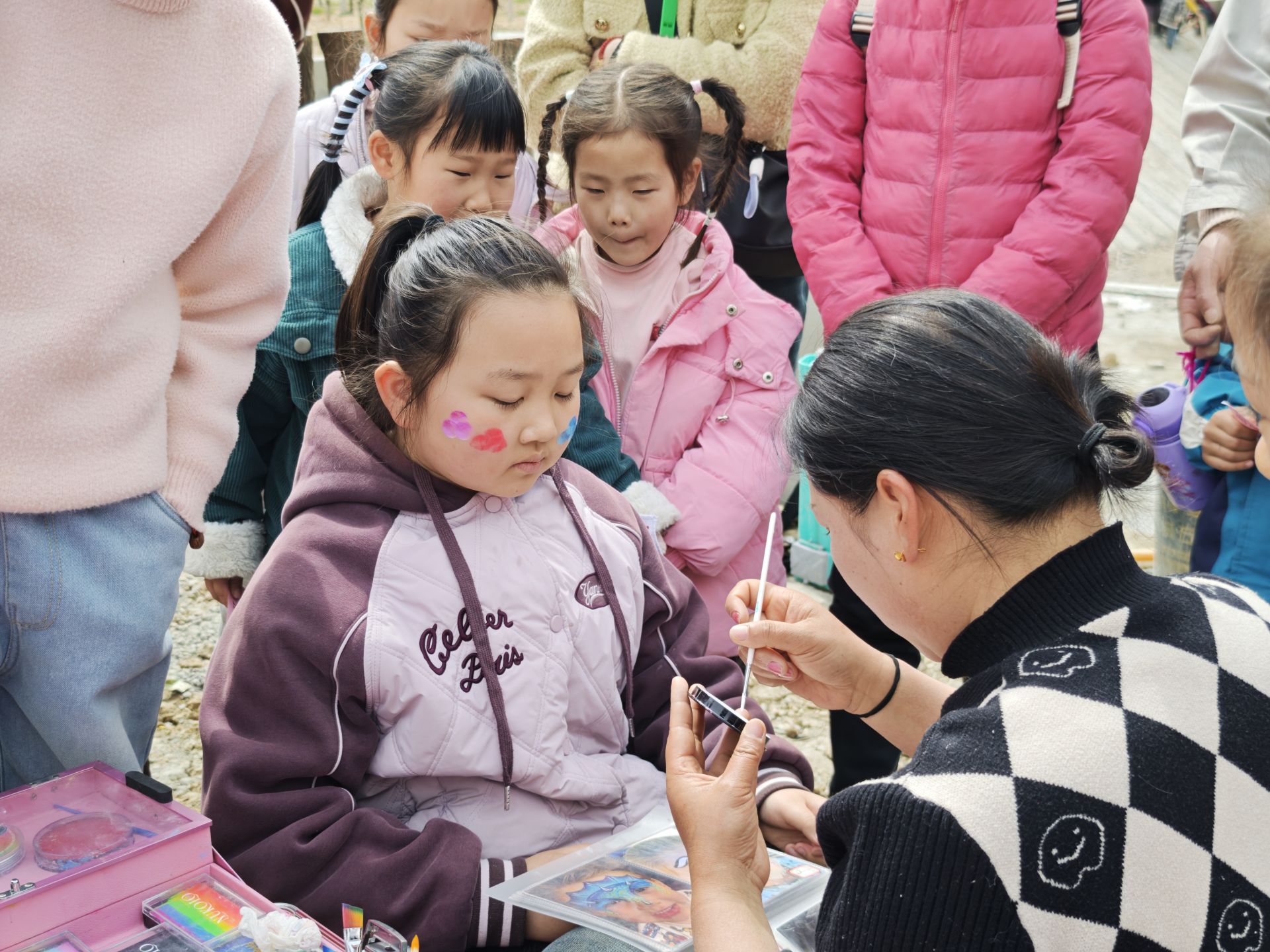 非遗体验区成为亲子家庭聚集地。手绘风车、漆扇制作、面部彩绘三个体验台前排起长队。现场工作人员指导游客在素白漆扇上勾勒各式形状:“每把漆扇需经过多道工序,这种沉浸式体验能让传统文化真正‘活’起来。”面部彩绘区域也十分受欢迎,专业彩绘师用手中的画笔,为孩子们的脸庞增添了别样的色彩。