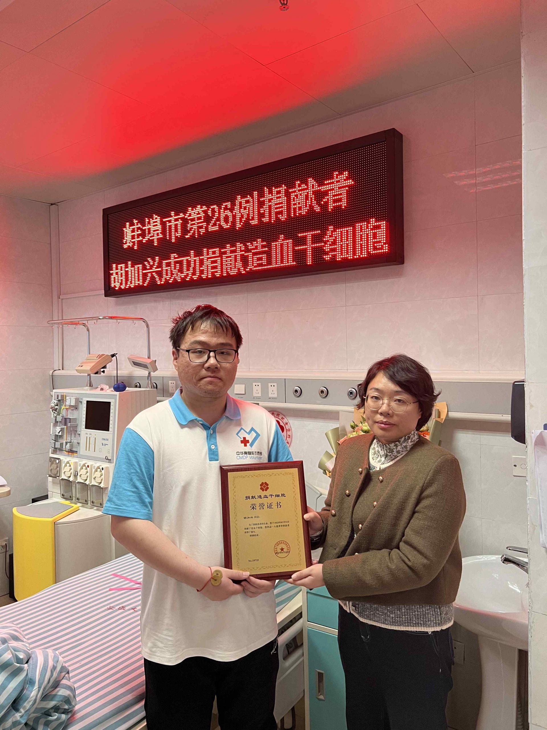 蚌埠发布客户端讯 (融媒体首席记者 陈瑶 通讯员 吴启迪)近日,我市两位志愿者相继完成造血干细胞捐献,以无私善举为血液病患者点燃生命希望。其中,蚌埠卷烟厂职工臧一霏历经两次配型终圆捐献夙愿,蚌埠医科大学学生胡加兴则成为我市将“捐献造血干细胞纳入见义勇为行为”范围后的首位捐献者。