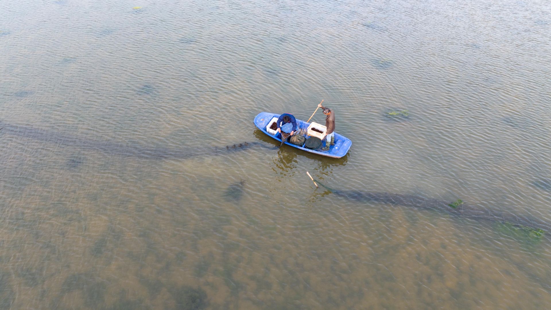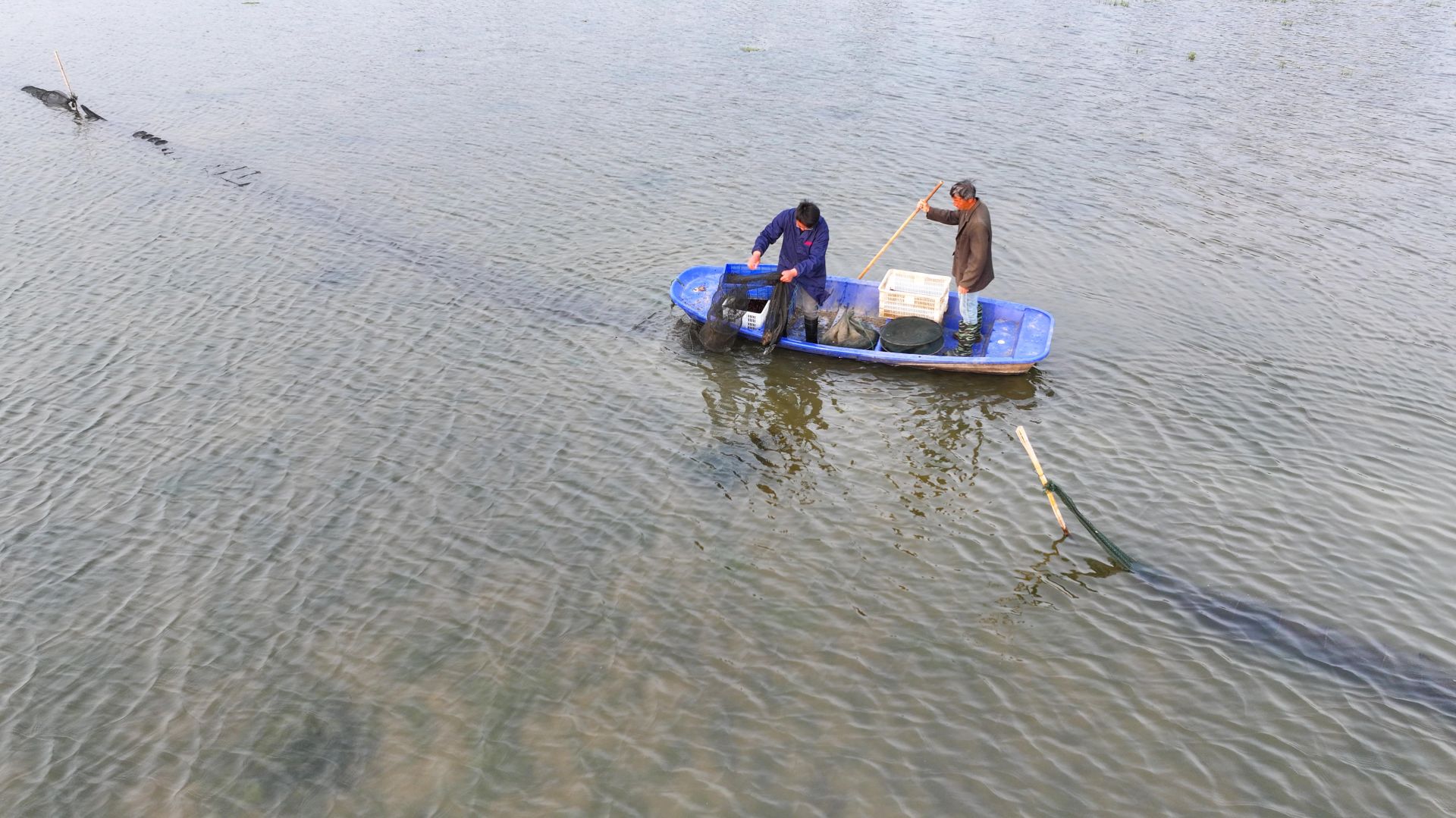 取笼结、收虾笼……在工人们一番娴熟的操作下,水花四溅,一只只壳红、身白、头大、尾宽的鲜活小龙虾便随着笼网跃出了水面。随后,工人们挥舞臂膀用力一抖,小龙虾便纷纷滚落入船中。