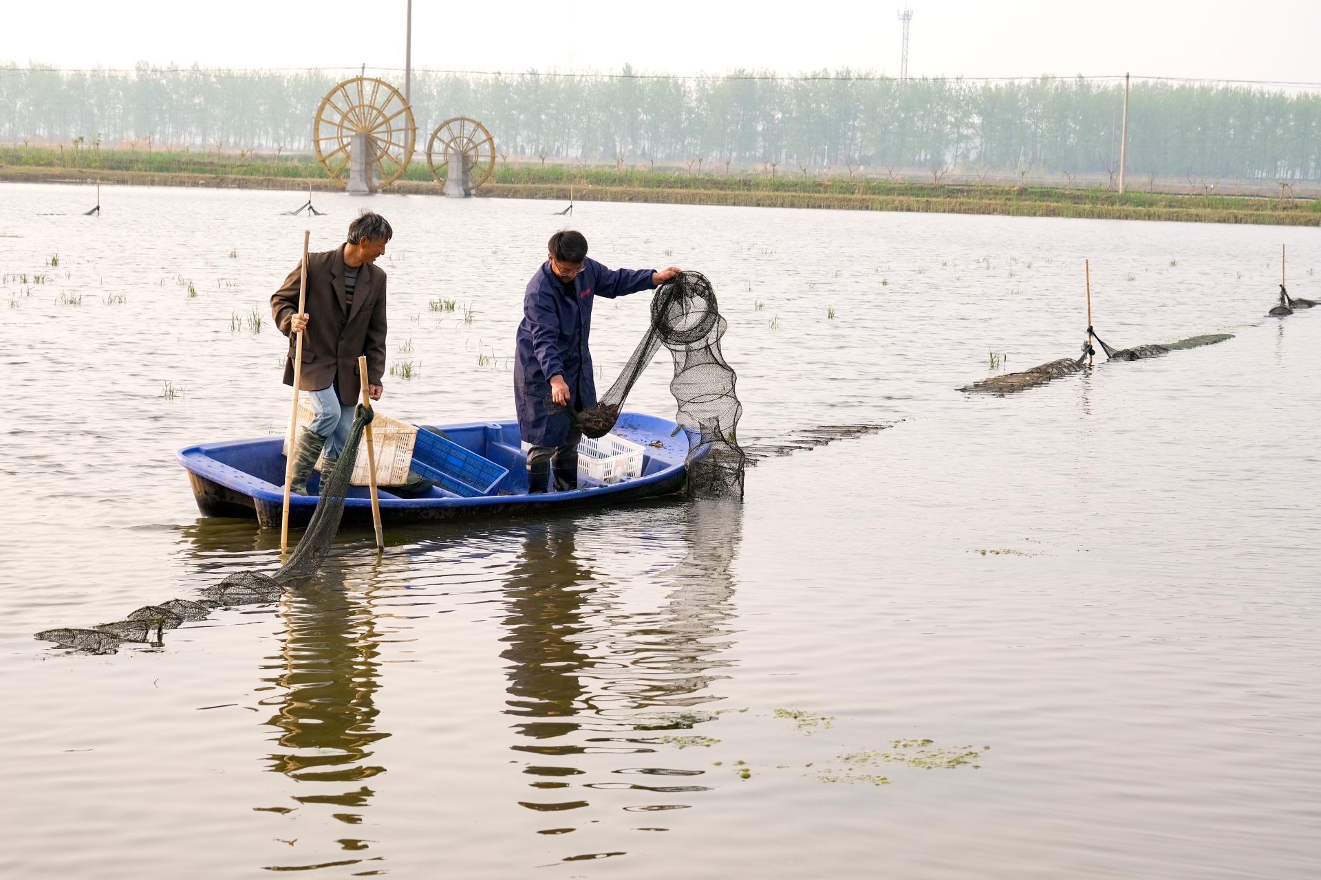“这虾个头大,壳的软硬刚刚好,肉质饱满,肯定好吃。”基地负责人黄跃宗随手拎起一只刚刚捕捞上来的小龙虾,乐呵呵地展示,这个品次的首批龙虾能卖个不错的价格。这只是初步分拣,大虾中虾分拣到一起,等下拿到基地内再用分拣机进行精分拣。分拣出来的虾苗要立马放回田中,一个月后虾苗就能长成商品虾。