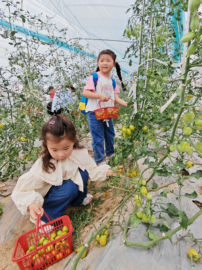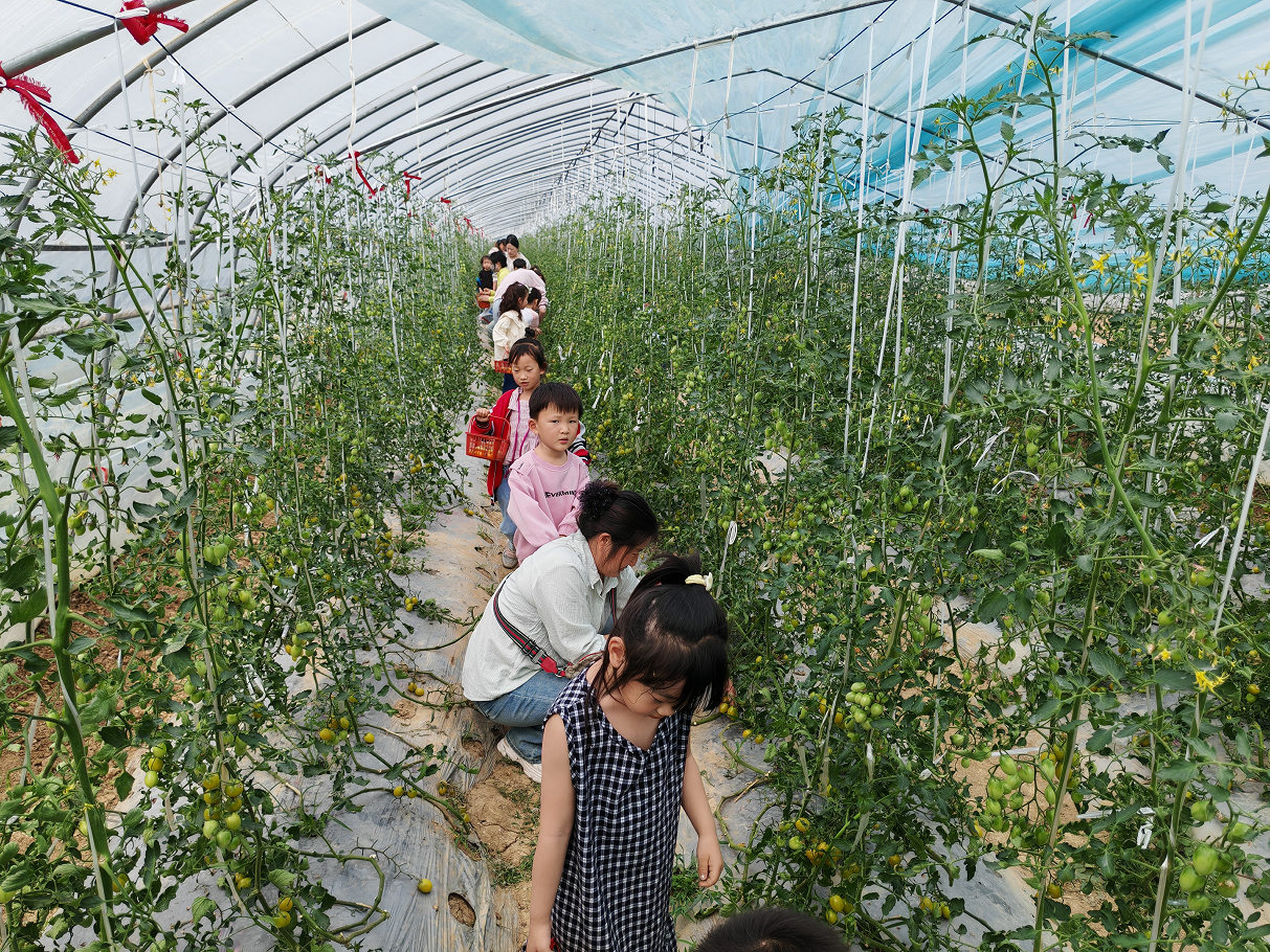清明过后,田野一片绿色,油菜花尚未落尽,孩子们对田野的一草一木都十分新奇。在老师和家长的陪同下,一个个走进大棚内,看到色彩各异的小番茄,更是兴奋,不一会儿,小篮子里就装满了红的、绿的、紫的金珠番茄。