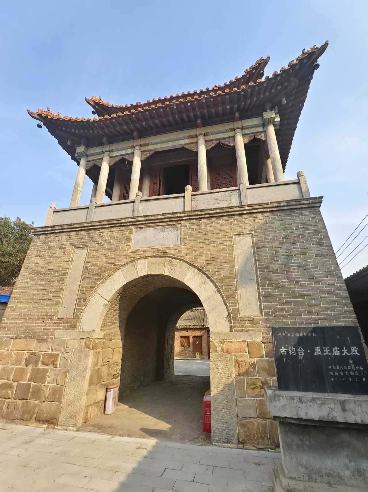 台基正上方,书写着“古钧台”三字。门洞两侧,镶嵌着一副对联:“得名始于夏,怀古几登台。”