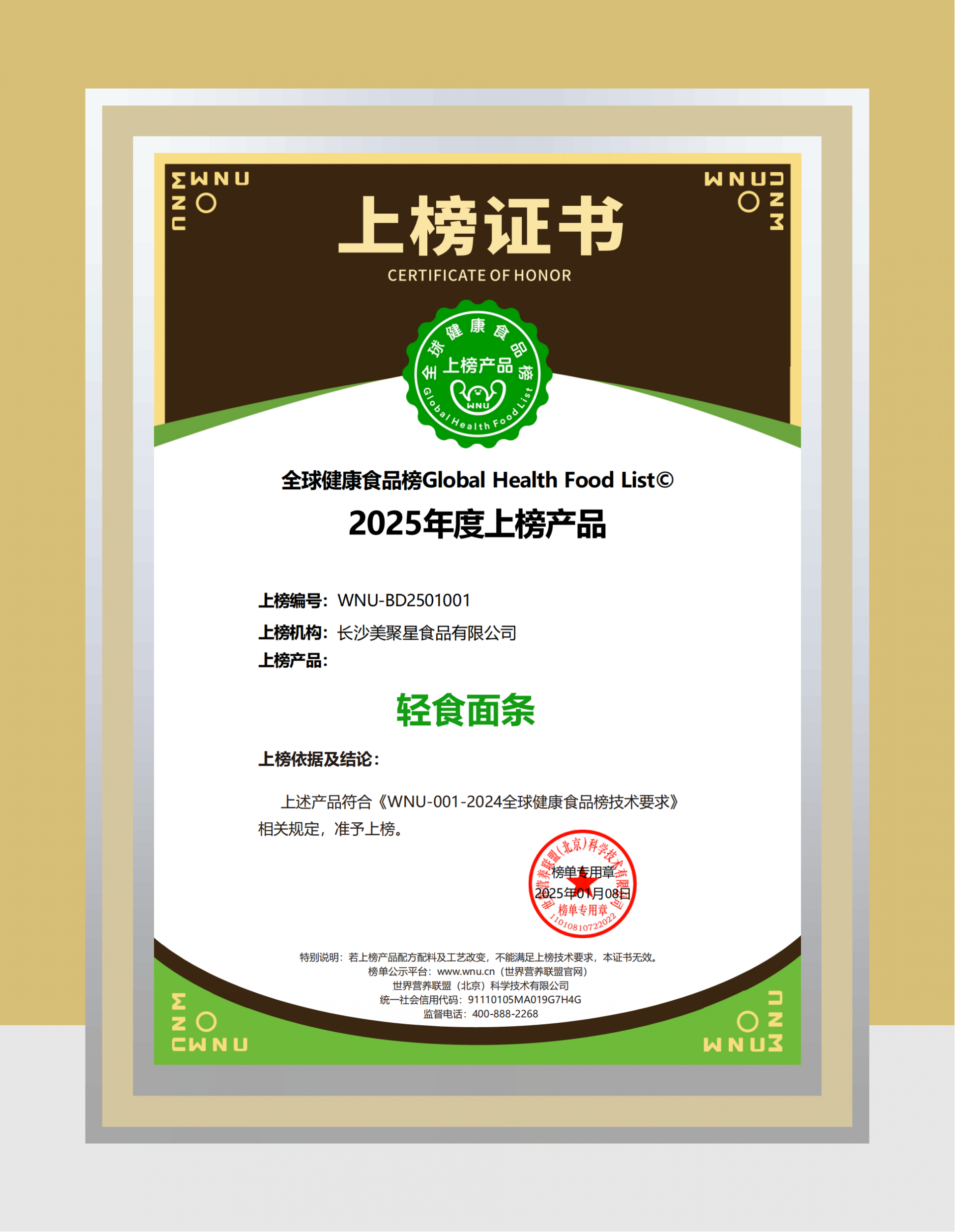 全球健康食品榜(Global Health Food List)由世界营养联盟(World Nutrition Union,简称WNU®)面向全球食品领域推出的年度榜单项目。推出榜单的主要目标是推动食品、饮食领域迈向营养健康高品质时代。具体来说,推荐营养素如蛋白质、膳食纤维、维生素、矿物质需要达到一定比例才能获得相应的加分;而限制营养素如饱和脂肪酸、钠、糖则需控制在一定范围内,否则将扣分甚至导致产品无法上榜。对产品配方配料、食品添加剂和工艺也有严格要求。全球健康食品榜评价体系处于全球领先地位,能上榜的产品必须是食品里的佼佼者。