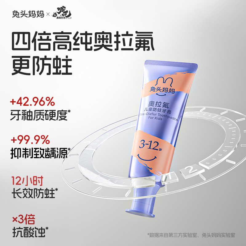 自研奥拉氟,便是兔头妈妈坚持科研创新的一个缩影。兔头妈妈专注儿童防龋领域,其在2021年为国内首次引进进口奥拉氟,到2023年启动自研创新,目前取得多项相关科研成果,覆盖奥拉氟成分的制备、检测、及衍生物的合成。2025年1月推出新一代高纯奥拉氟牙膏产品,将成果实现产品落地,其核心防蛀原料为自研新一代高纯奥拉氟,其纯度超越普通氟、进口奥拉氟,不仅纯度实现三连跳,防蛀功效上也有显著提升,从三方实验室数据对比看,可实现儿童牙釉质在28天内硬度提升42.96%、抗酸蚀能力提升65.8%,12小时长效防蛀,抑菌率达99.9%。