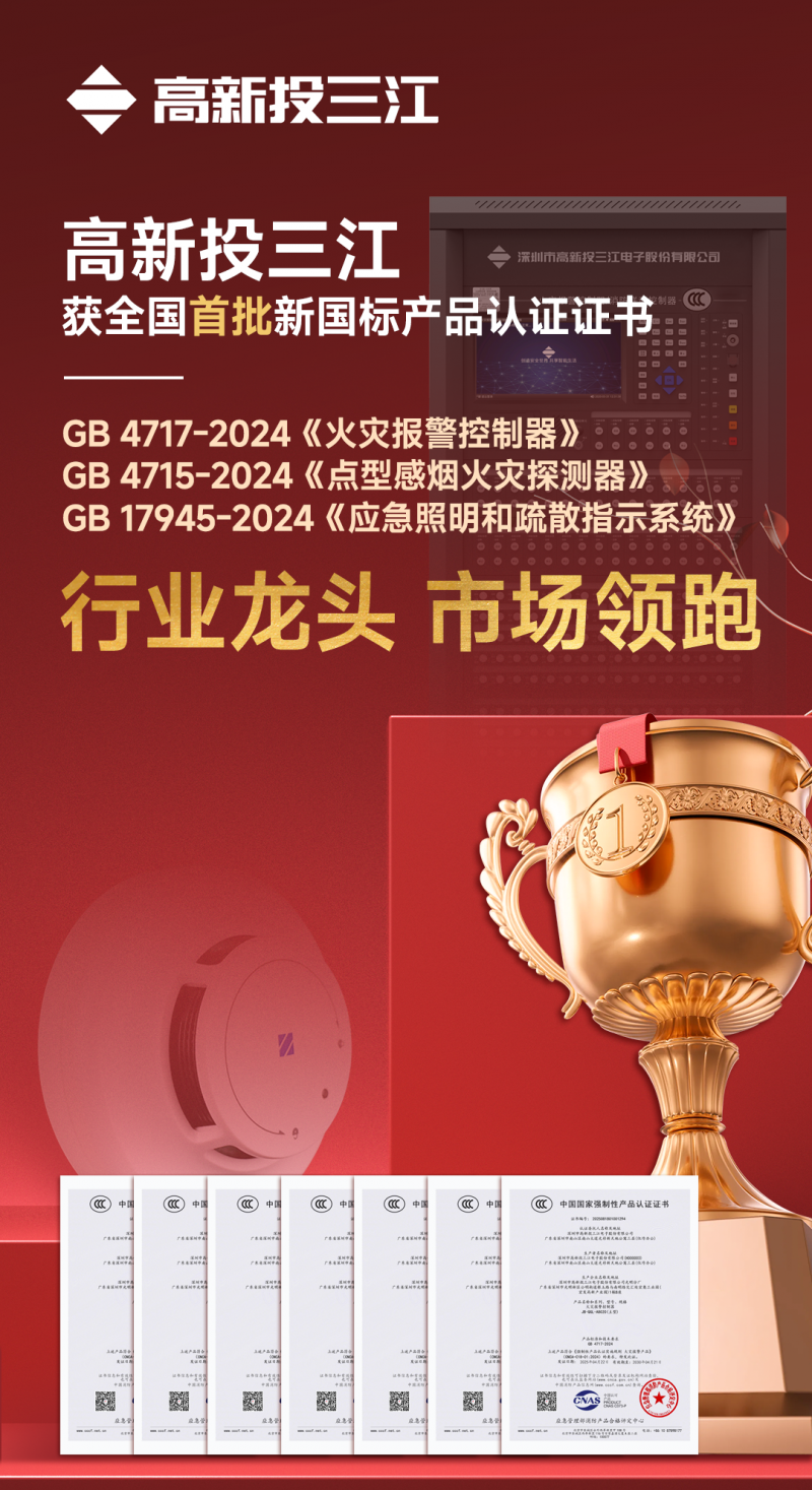 随着现代建筑功能与结构日趋复杂多元,高层、地下空间及综合体等场景的消防安全面临全新挑战,GB 4715-2024《点型感烟火灾探测器》、GB 4717-2024《火灾报警控制器》和GB 17945-2024《应急照明和疏散指示系统》三项消防新国家标准政策将于5月1日正式实施。高新投三江凭借自主研发实力与全链路技术布局,产品通过国家检验认证,成为消防行业首批通过国家新国标认证证书的企业。这不仅是权威对三江产品的认可,更印证了持续领跑行业标准、定义技术标杆的硬核实力。
