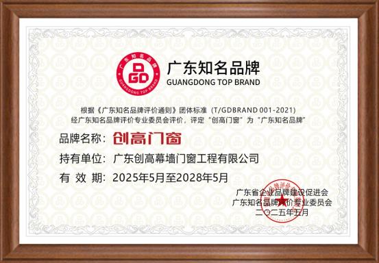 此次蝉联“广东知名品牌”,是创高门窗品牌发展的重要里程碑。未来,创高门窗将持续加大研发创新、品质提升和服务优化投入,推出更多优质产品,发挥行业引领作用,为广东品牌发展、品牌强国战略推进贡献力量,续写品牌发展新篇章。