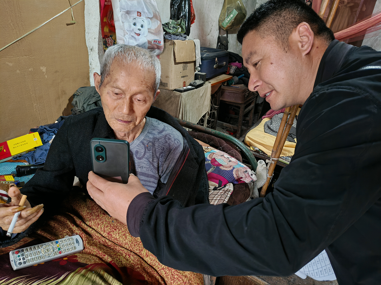 三巷村村干部王永生(右)在农户侯中旺家中开展网签认证。侯中旺因病卧床。