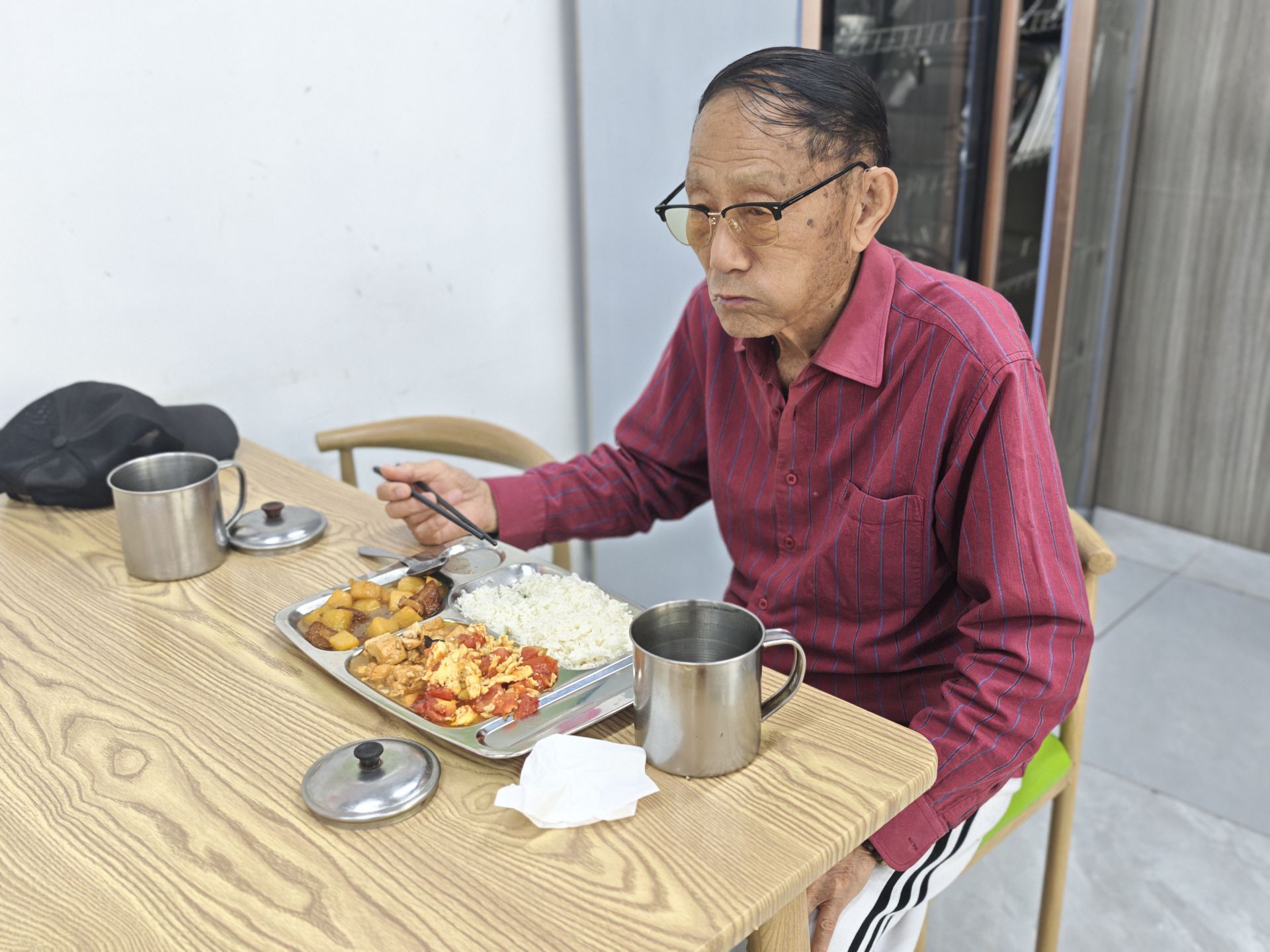 中午11点半,社区老年食堂飘出阵阵饭香,土豆烧牛肉、西红柿炒鸡蛋、时令蔬菜、营养汤等菜品整齐摆放,十余名老人正排队取餐。“孩子工作忙,我一个人做饭麻烦,这里饭菜软烂、价格实惠,还能和老朋友们聊天!”90岁的袁琍老人说,自己住在恒大御景湾,本不是这个社区的居民,但因为这家老年食堂有口皆碑,每天吃饭的老年人多,所以他特意跑到这边来吃午饭。