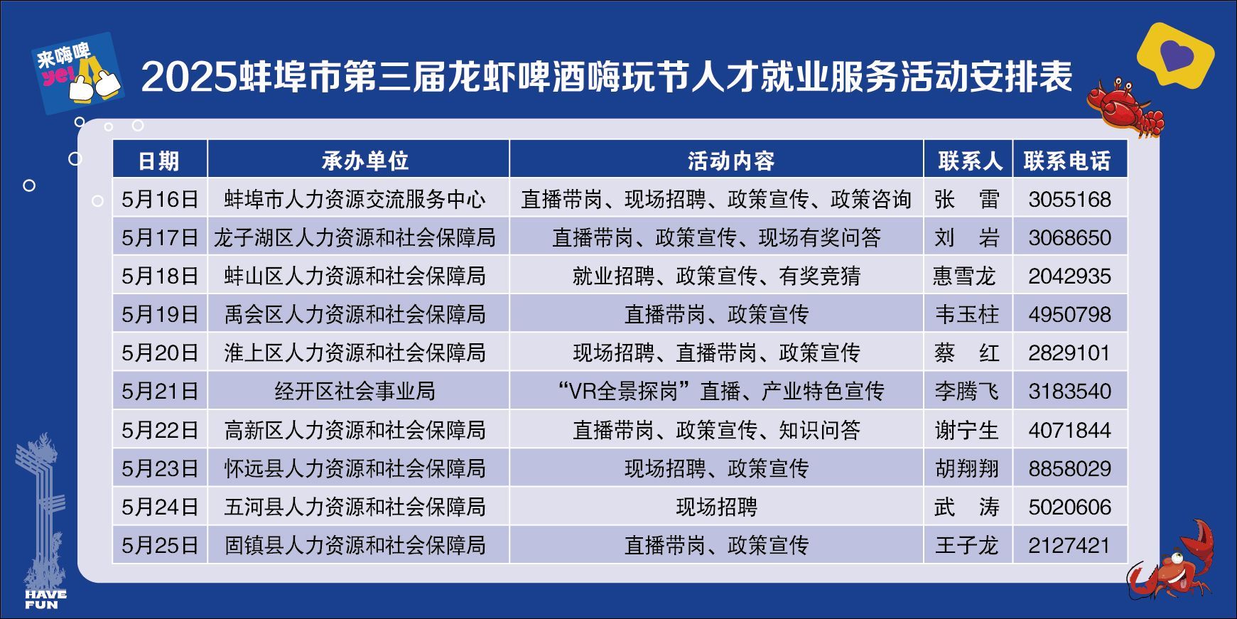 把握黄金招聘时段,共襄人才夜市盛会。全市人社部门定于5月16日至25日龙虾啤酒嗨玩节期间,在淮河文化广场开展“挑灯觅才 就在蚌埠”系列人才就业服务活动。通过夜市场景搭建人岗精准对接平台,助力求职者实现“家门口”就业,帮助企业拓宽招才渠道。欢迎广大企业报名参与,具体事宜可咨询市人力资源交流服务中心和各县区人社局。