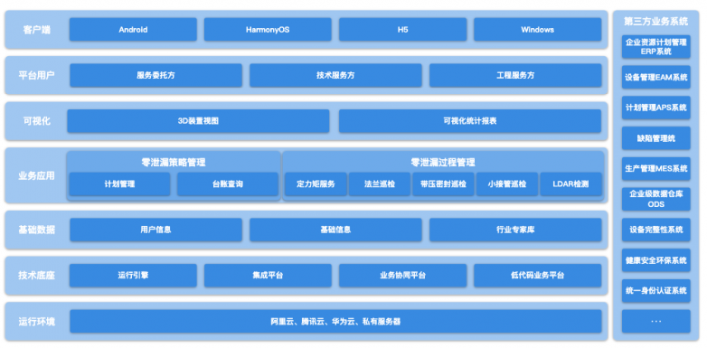 体系以自主创新的零泄漏生态服务(LES)平台为数据底座,一系列“数字化·可视化·一站式”的现场技术服务(包含数字化定力矩技术服务及配套服务(自动化螺栓清洗服务和法兰面在线修复服务)、零泄漏质量检测技术服务、冷切割技术服务、泄漏检测与修复(LDAR)技术服务等)为抓手,通过数字化平台与现场技术服务的紧密结合,以数据驱动泄漏安全闭环管理,筑牢安全生产防线,推动石化行业向智能化、高效化方向迈进。