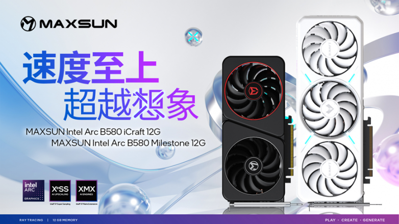 作为英特尔的重要合作伙伴,铭瑄和英特尔在科技领域的探索和创新不仅只体现在主板产品。双方深度合作的MAXSUN Intel Arc B580 系列显卡,涵盖iCraft和Milestone两个系列——MAXSUN Intel Arc B580 iCraft 12G和MAXSUN Intel Arc B580 Milestone 12G,高频散热双优,助力用户突破创作与竞技边界。