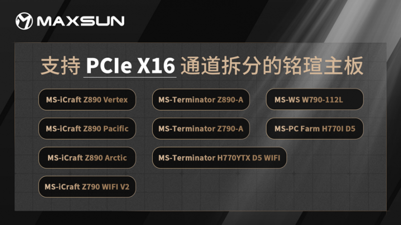 该显卡采用PCIe5.0 X8+PCIe5.0 X8接口设计,只需主板支持PCIe X16 通道拆分为 X8+X8,即可在消费级平台上实现高效运行,大幅降低部署大模型的整机成本。铭瑄多款主板支持PCIe X16通道拆分,助力显卡双芯性能满血释放。