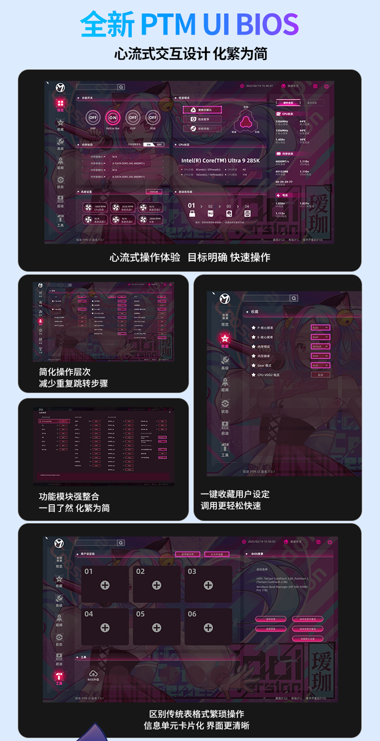 PTM UI BIOS借鉴手机APP的交互逻辑,采用PTM设计理念(PC To Mobile),将所有功能模块化后再进行聚焦式设计,让所有交互层级不超过2层。(注:配图为瑷珈主题主板PTM UI BIOS界面)