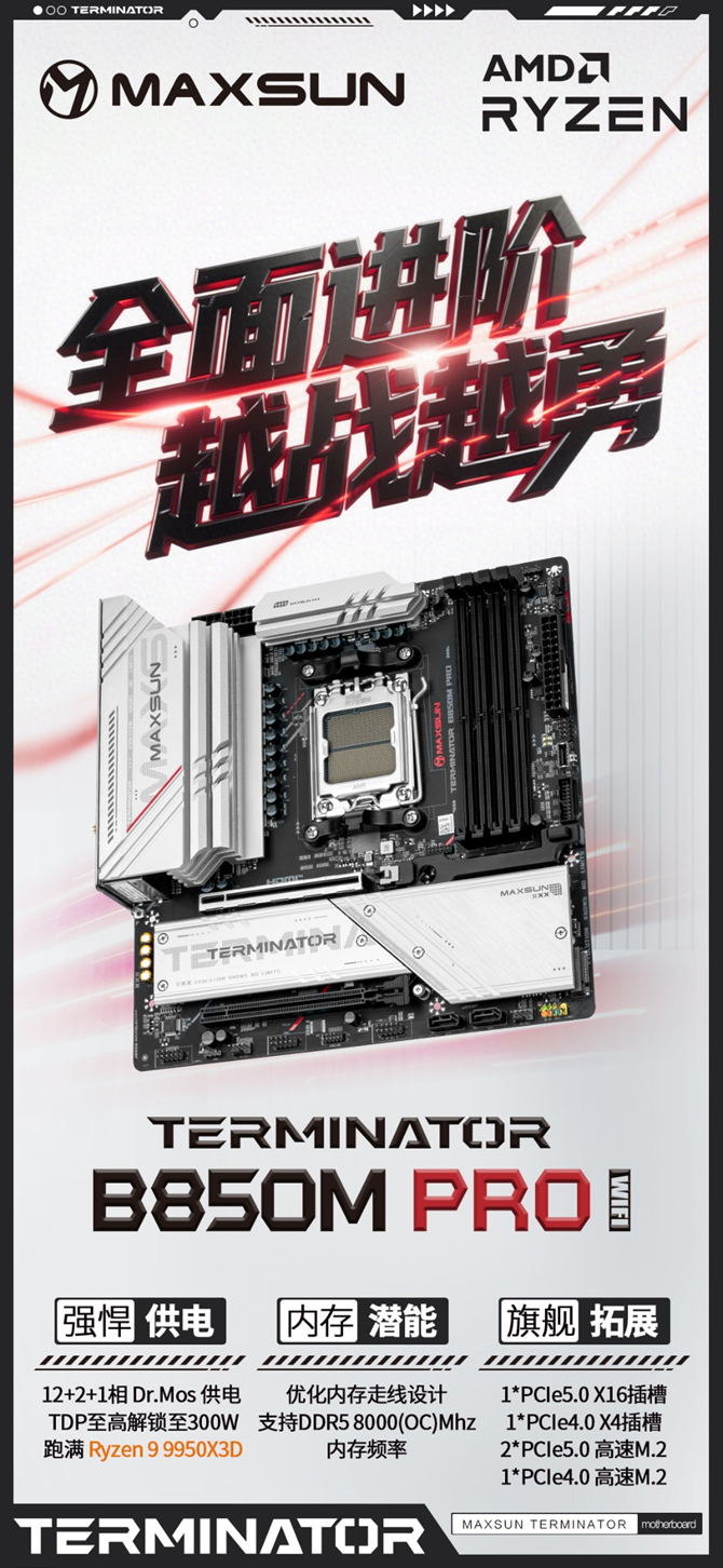 除了持续推出新品满足不同需求外,铭瑄在原有产品系列上也不断进行优化,为用户带来全新的体验。MS-Terminator B850M PRO WIFI采用了全新终结者系列设计语言,以机器战甲为灵感内核,暗红线条如机甲血脉持续灌输电竞能量,更大面积的全金属装甲,尽显科技感的同时强劲提升散热性能。
