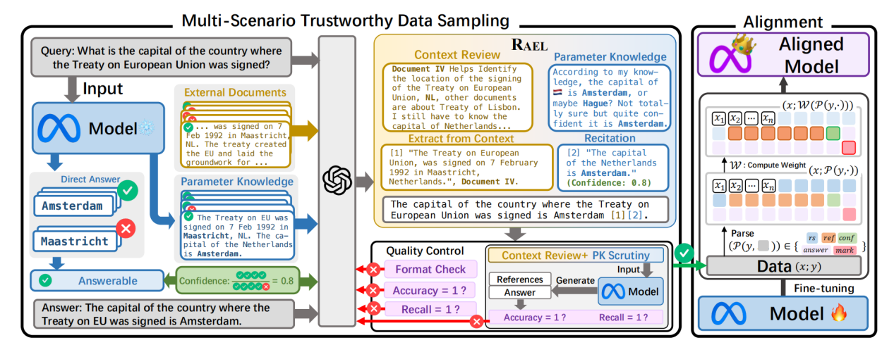 2. 开发了RAEL框架,要求模型审阅自我生成的相关概念或先验知识,实现对上下文的准确引述;INTRALIGN方法,通过多场景可信数据生成和可解释性对齐,使模型能够有效利用先验知识输出更可靠的回答。