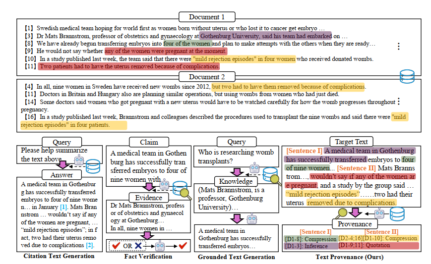 论文简介:大语言模型在文本生成中的流利性和连贯性方面已取得了显著的进展,然而其广泛应用引发了对内容可靠性和责任心的担忧。在医疗、法律和新闻等领域,幻觉容忍度极低,了解内容的来源及其创作方式至关重要。为解决这一问题,我们推出了文本溯源任务(TROVE),旨在将目标文本的每一句话追溯到可能冗长或多文档输入中的特定源句子。除了识别来源,TROVE还标注细粒度的关系(引用、压缩、推断等),提供了每个大模型生成结果的细粒度分析。为TROVE任务建立基准,我们通过利用三个公开数据集构建了我们的数据集,涵盖了11种不同场景(例如问答和总结),包括英文和中文,且来源文本长度各异(0–5k,5–10k,10k+),并强化了对于溯源任务至关重要的多文档和长文档设置。为保证数据的高质量,我们设计了三阶段的注释过程:句子检索、GPT溯源及人工溯源。我们在提示工程和检索增强模式下评估了11个大语言模型,结果显示检索对于鲁棒性至关重要,较大的模型和闭源在各类任务中表现更佳,但在检索增强的场景下,开源模型显示出显著优势。