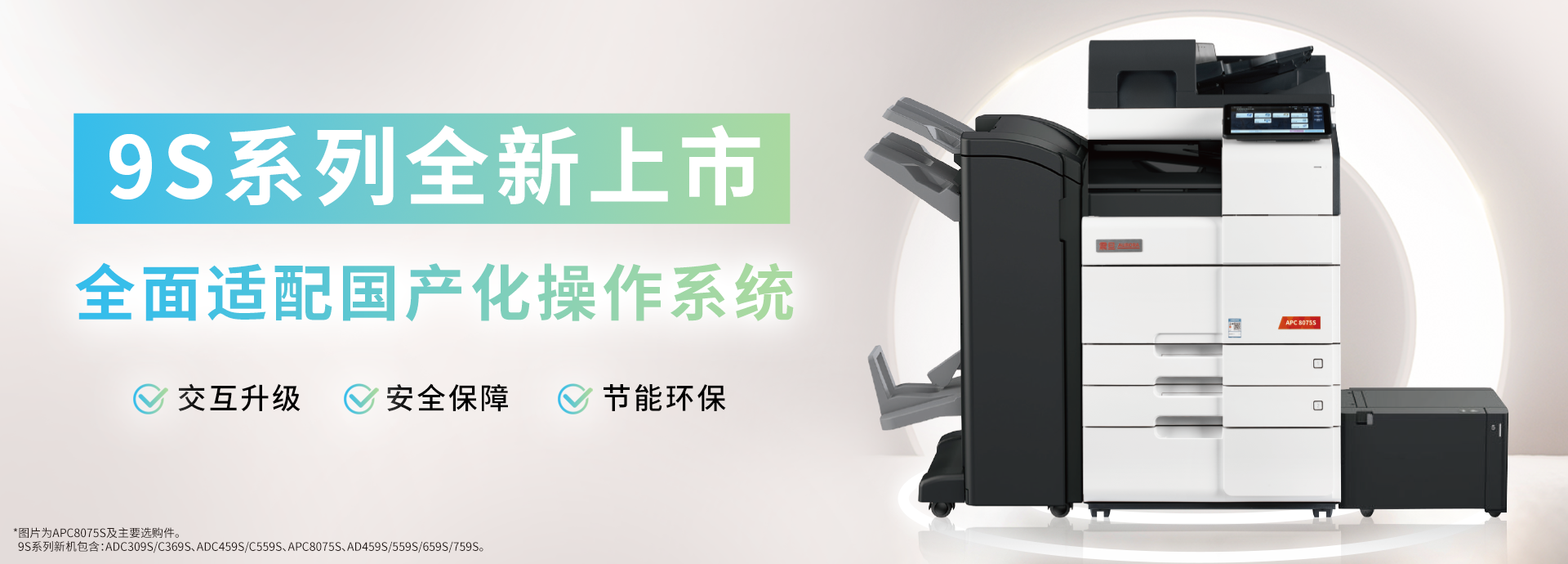 近日,震旦发布9S中高速系列新机,新机一共9款产品——震旦ADC309S、震旦ADC369S、震旦ADC459S、震旦ADC559S、震旦APC8075S、震旦AD459S、震旦AD559S、震旦AD659S、震旦AD759S。该系列包含彩机、黑白机、PP机(生产型印刷机)、覆盖中高速段,支持最大幅面A3+打印,在高效输出、环保认证、安全保密方面再升级,全面适配国产化操作系统,为中大型企业、中大型规模办公室、图文店等企业提供多样选择。