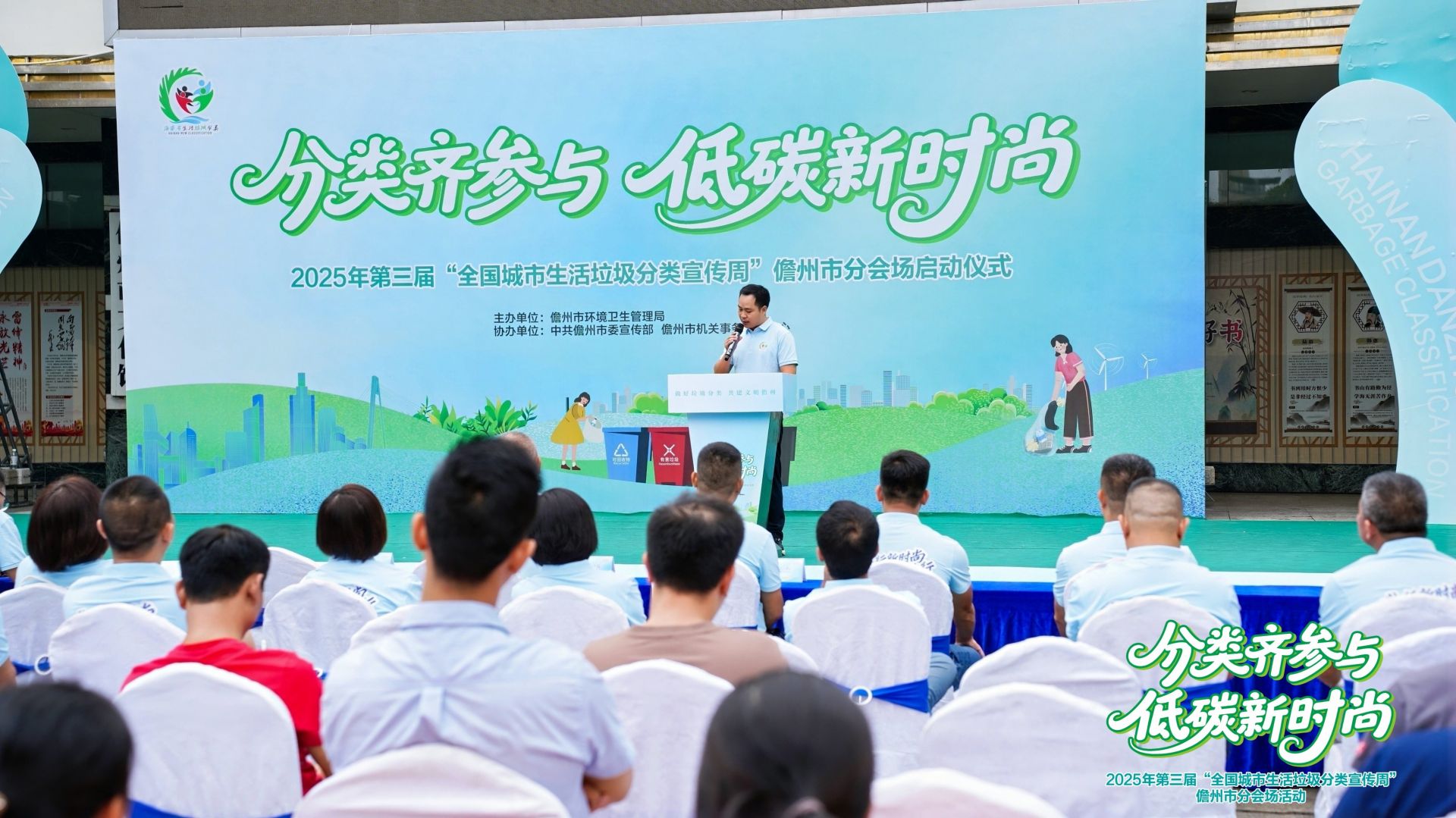 启动仪式在环卫工人演绎的儋州调声《大美海南我爱你》中拉开序幕,悠扬的歌声传递出对海南这片土地深深的热爱和对美好环境的向往。随后,市政府副秘书长刘益男发表了热情洋溢的致辞,强调了生活垃圾分类的重要性,并提出了三项要求:深化生态文明思想实践、精准提升分类工作质量与效益、推动分类工作长效惠民。市环卫局局长孙占南也发表了讲话,分享了儋州市在垃圾分类工作上取得的成就,并对未来的发展提出了展望。