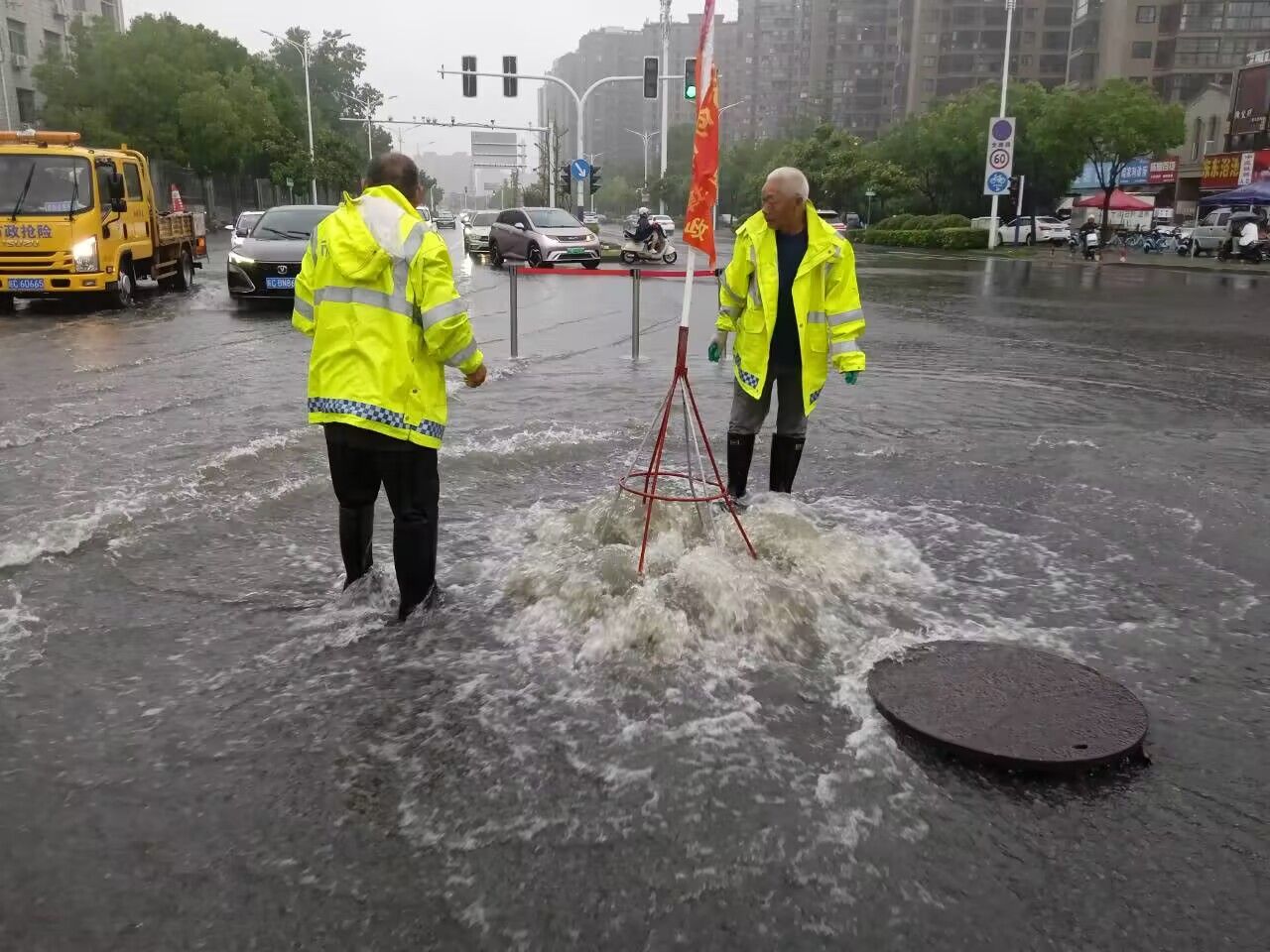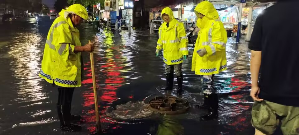 根据实时雨情,市政部门对积水路段临时开启检查井加速排水,对被顶托的井盖及时防护复位,及时清理雨水篦子上的杂物,避免堵塞影响排水;所有排水泵站全力抽排,加快区域积水排出。