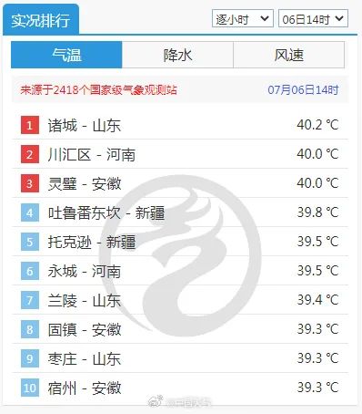 截至7月6日14时,山东诸城以40.2℃位于全国高温排行榜第一。