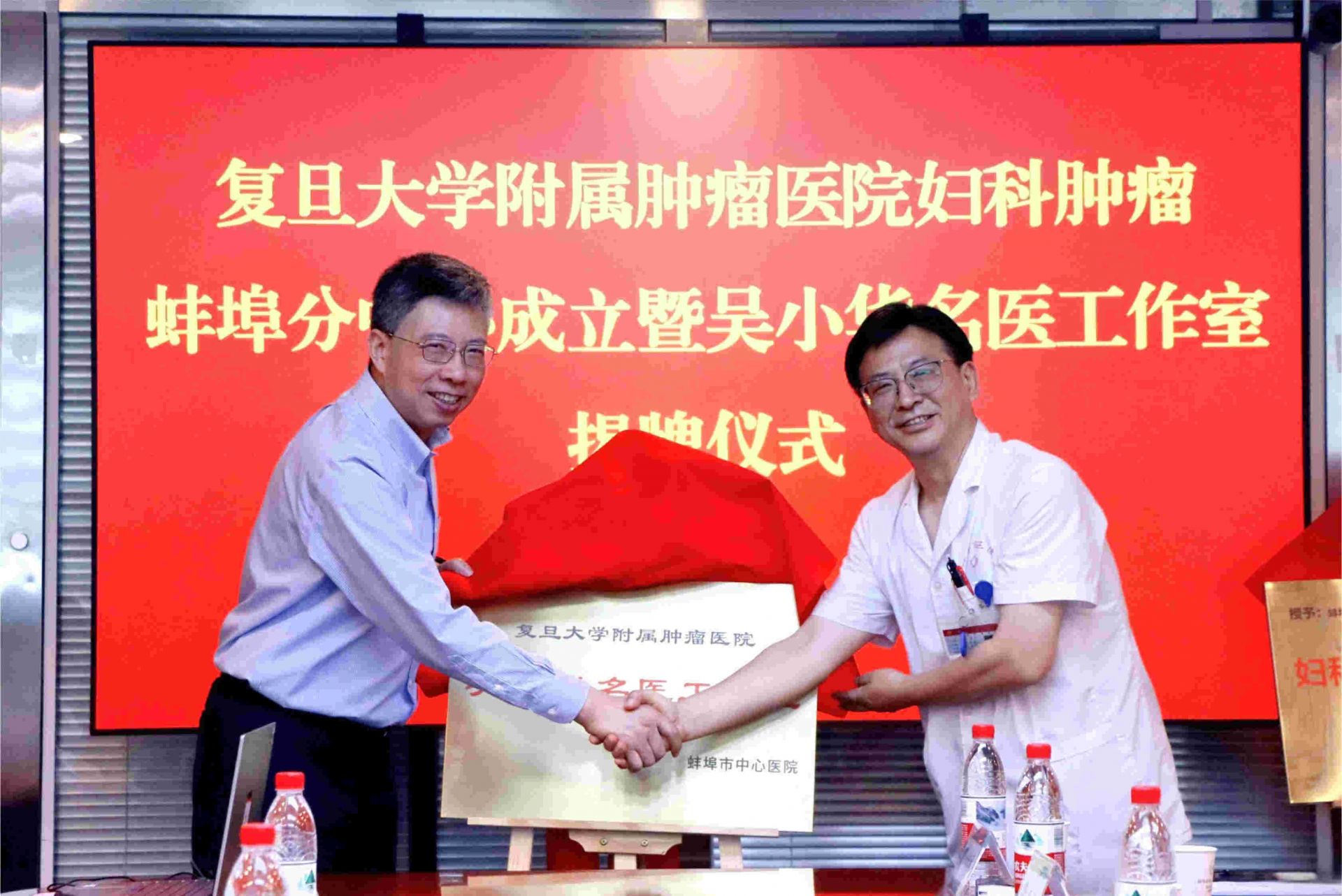 在与会嘉宾的共同见证下,复旦大学附属肿瘤医院妇瘤科主任吴小华教授与蚌埠市中心医院党委书记郭政新共同为“复旦大学附属肿瘤医院妇科肿瘤蚌埠分中心”和“吴小华名医工作室”揭牌。