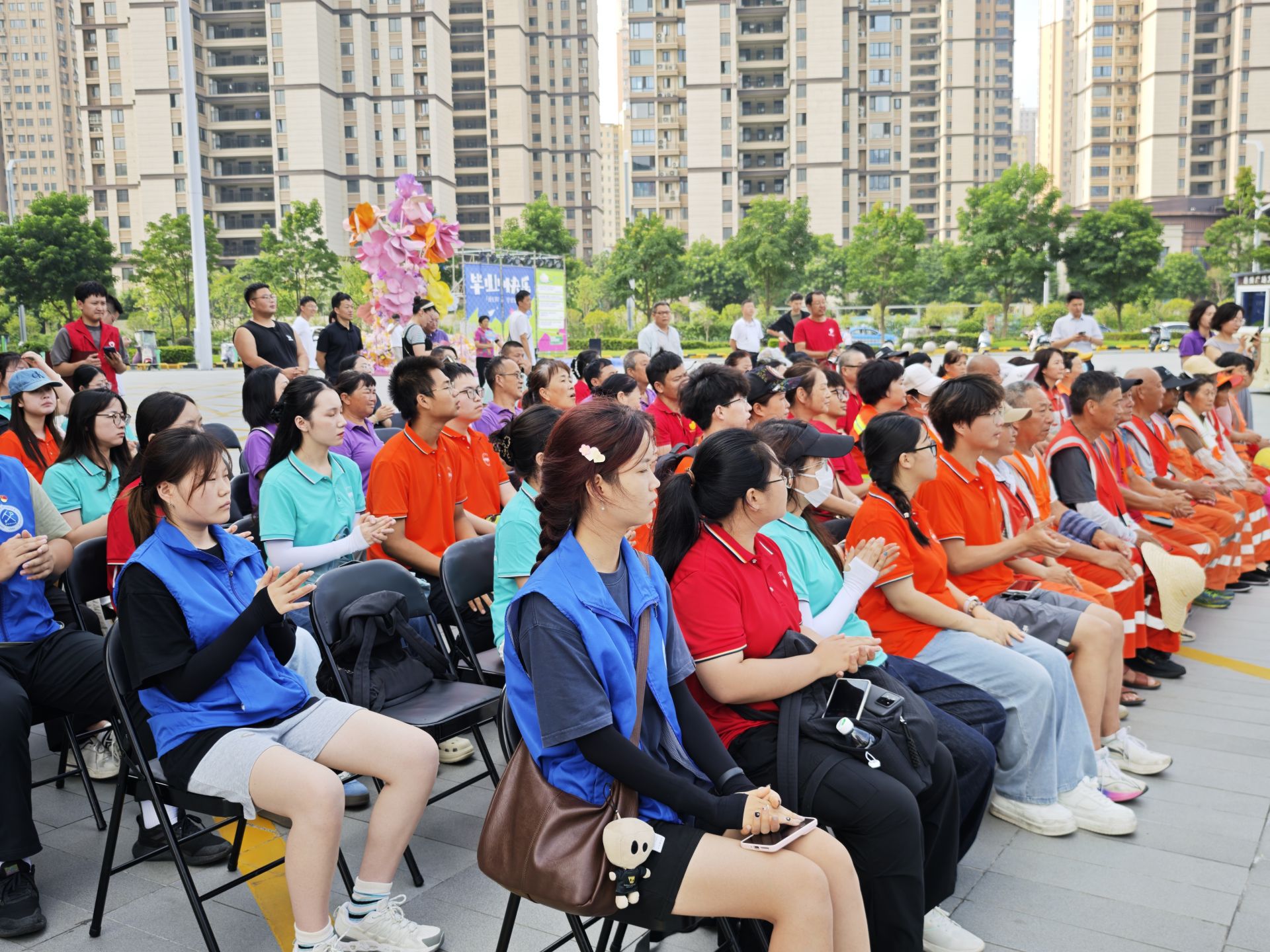 活动于上午8时在吾悦广场拉开帷幕。现场,来自全市的环卫工人、建筑工人、城管队员等25名户外工作者代表,以及青年志愿者、来自合肥工业大学和安徽理工大学的“三下乡”青年学子等共计80余人参加了发布活动。
