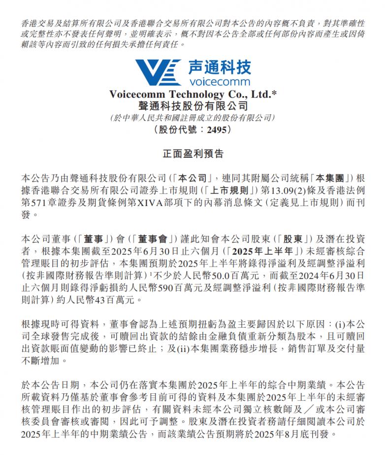 声通科技坚实的产业筑底、领先的技术创新亦已获得资本市场的双重认可。7月9日,公司发布2025年上半年正面盈利预告,预计净利润不低于5,000万元,同比大幅增长。