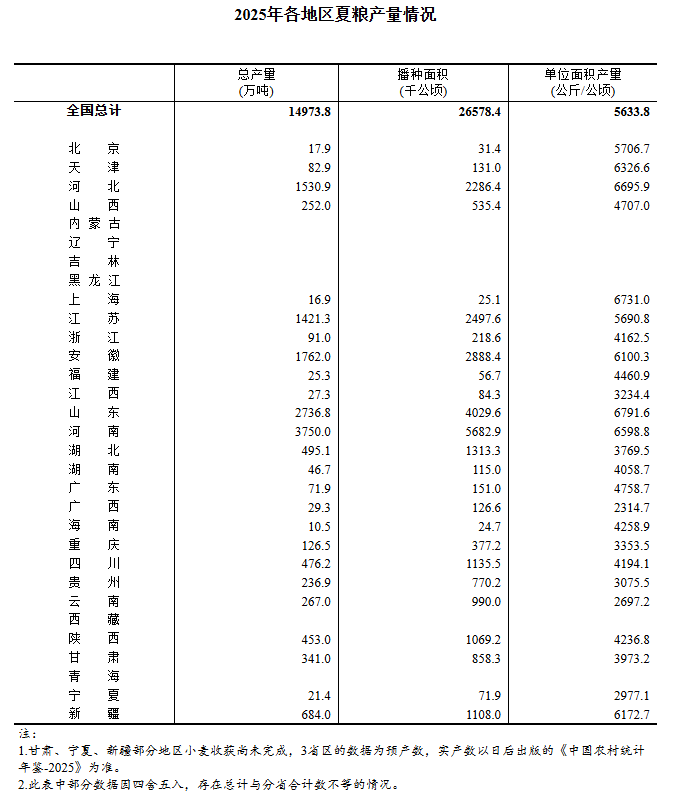 7月10日,国家统计局发布数据,根据对全国25个夏粮生产省(区、市)的调查,2025年全国夏粮总产量14973.8万吨,其中安徽1762万吨,位列全国第三,比2024年增加2.7万吨;全国夏粮播种面积26578.4千公顷,其中安徽2888.4千公顷;全国夏粮单位面积产量5633.8公斤/公顷,其中安徽6100.3公斤/公顷。