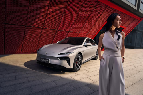 eπ007 深谙此道:宽体低趴车身、流畅溜背曲线,运动基因浑然天成。无框车门、隐藏式门把手、随速升降电动尾翼,行驶间自带“吸睛Buff”。