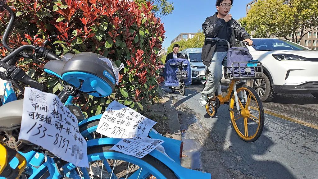 2025年3月21日,湖北省武汉市关山大道街头,不少共享单车上贴满了“房东直租”“低价甩租”“自家房出租”等字样的租房小广告。图片来源:视觉中国