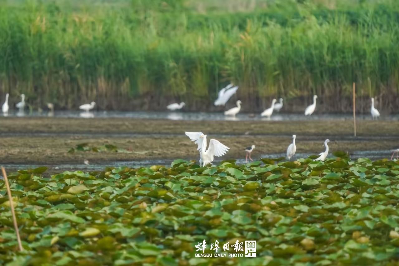 近日,晨光熹微,天河闸入淮口的水面泛起碎金般的光斑。李思端着相机蹲守在田埂上,镜头里,数十只白鹭,正在百米外的睡莲丛中觅食,红色额顶羽在晨风中轻轻颤动。