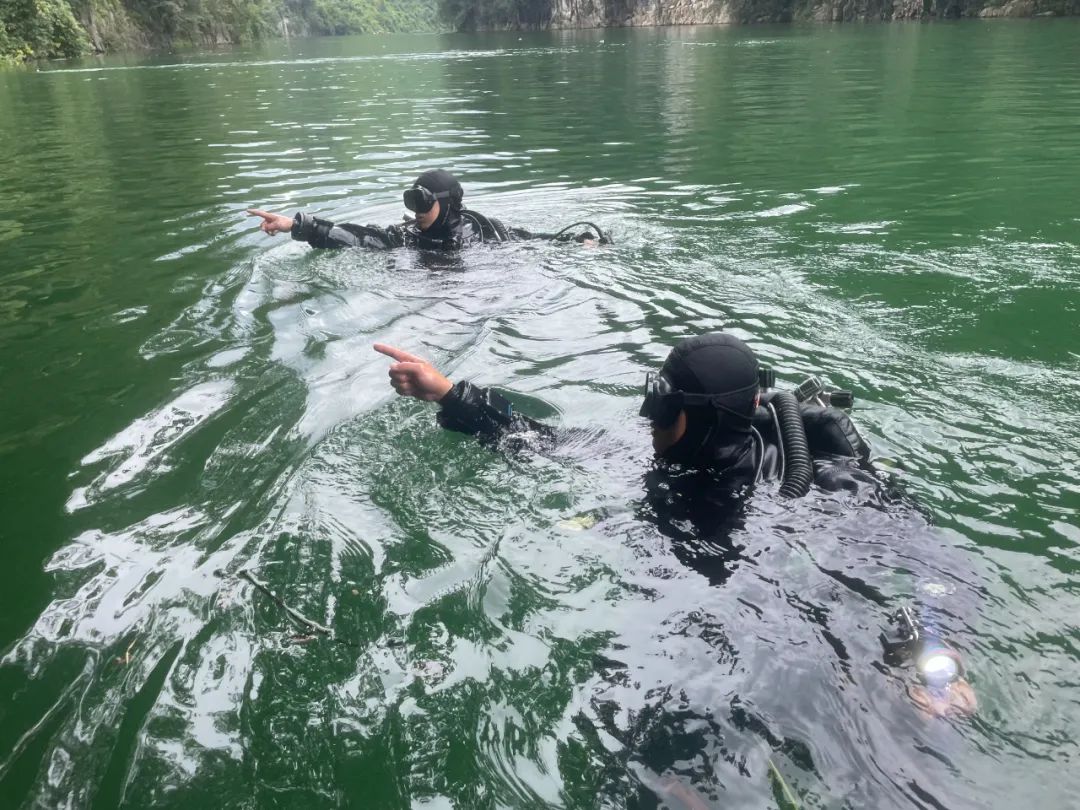 24日15时35分,队员闫明、刘承志接替开展第二潜工作,下潜深度达到15米。地下洞穴复杂曲折,能见度不足1米,只能依靠队员自身携带的光源顺着石壁摸索前行。16时50分,闫明单独潜回水面,带来了一个好消息和一个坏消息。