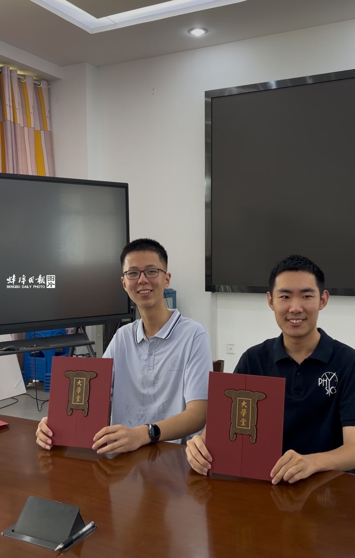 蚌埠发布客户端讯(融媒体记者 周芳林 文/图)7月28日上午,蚌埠第二中学学生周轩宇和罗天成同时收到了北京大学录取通知书,两人将续写从“高中同学”,到北京大学“同系同学”的缘分。