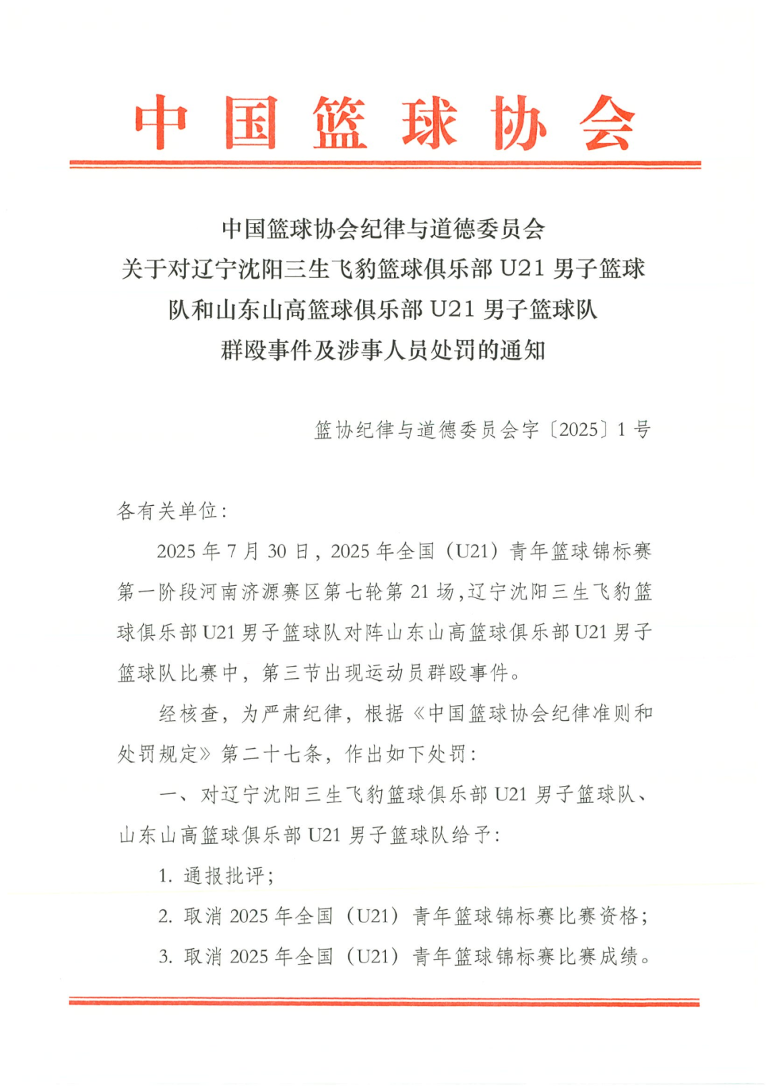 中国篮球协会纪律与道德委员会今日通过篮协网站发布了关于对辽宁沈阳三生飞豹篮球俱乐部U21男子篮球队和山东山高篮球俱乐部U21男子篮球队群殴事件及涉事人员处罚的通知。根据该通知,两支队伍被取消2025年全国(U21)青年篮球锦标赛比赛资格与成绩,此外多达28人被处罚,其中有4名球员被停赛三年。