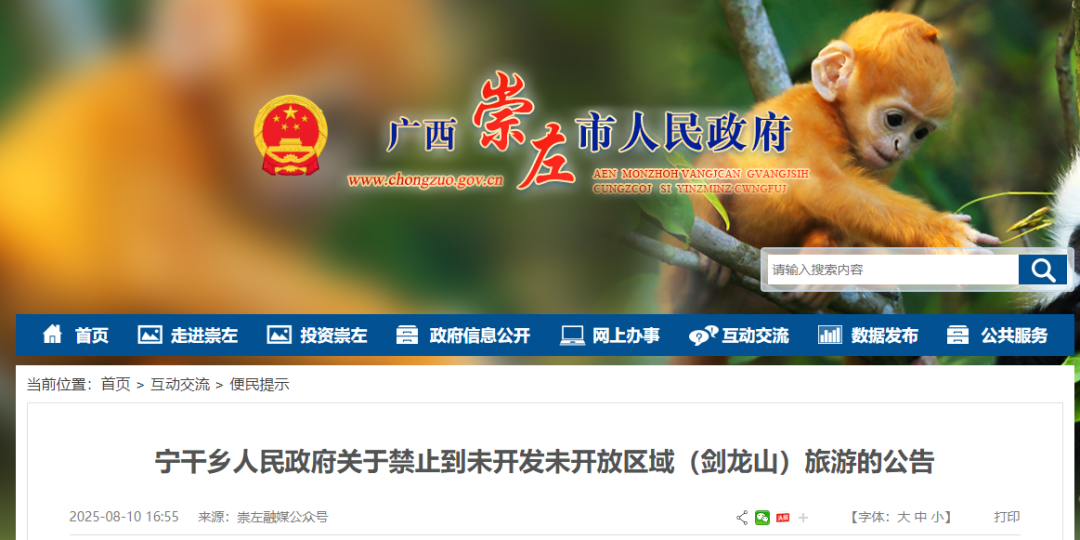 8月9日,广西崇左市天等县宁干乡人民政府发布了《宁干乡人民政府关于禁止到未开发未开放区域(剑龙山)旅游的公告》。