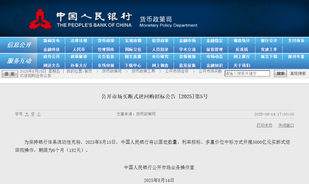 中国人民银行网站8月14日发布消息,为保持银行体系流动性充裕,2025年8月15日,中国人民银行将以固定数量、利率招标、多重价位中标方式开展5000亿元买断式逆回购操作,期限为6个月(182天)。