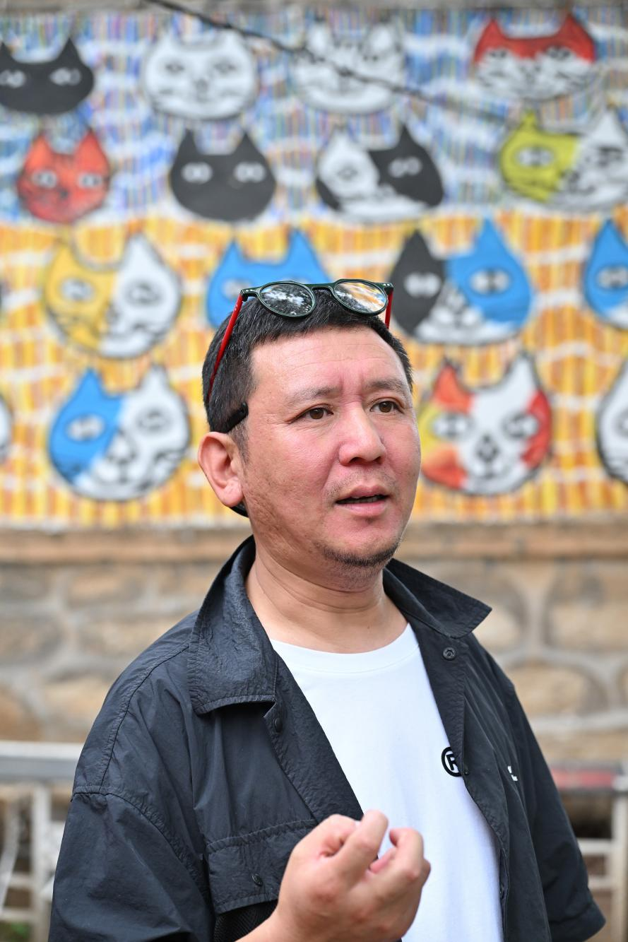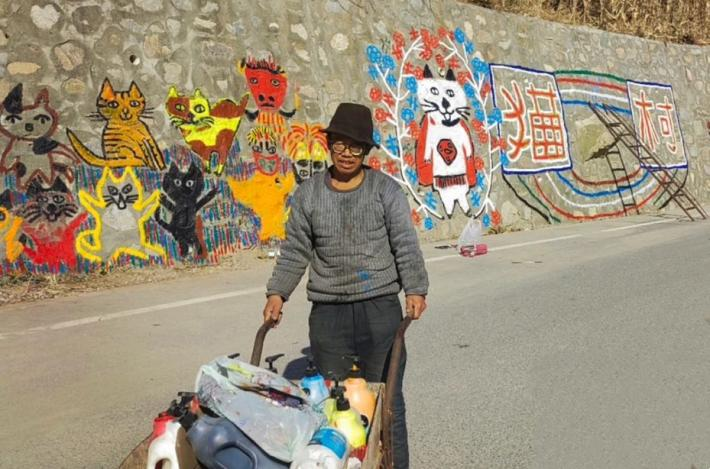 “狗小”今年50多岁,是位聋哑人,视力也不好,戴着啤酒瓶底厚的眼镜。6年前,在周合伟开办的公益画室,“狗小”第一次拿起画笔便展现出惊人的天赋。几年来,师徒二人一起用画作装饰猫村,举办猫村艺术节,让村子的每个角落充满艺术气息。