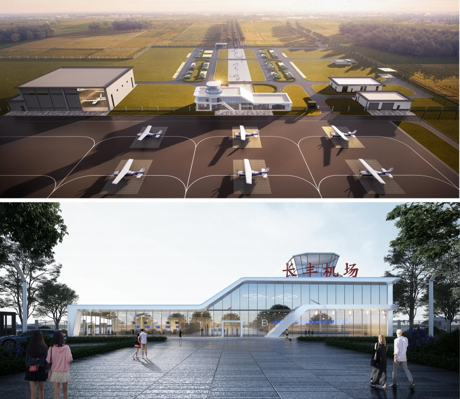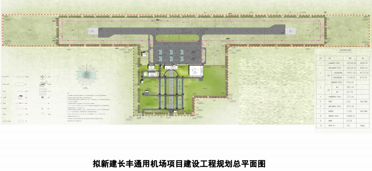 长丰通用机场项目位于长丰县左店镇高闫村,项目总用地面积为326349.94㎡,总建筑面积为5164.82㎡,计容建筑面积为7371.04㎡,容积率为0.02,建筑密度为1.43%,绿地率为25.20%。