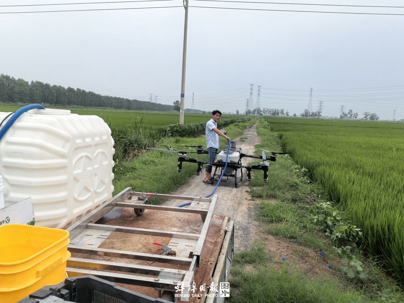 在曹顾张村的稻田上空,植保无人机正在进行“一喷三防”作业。一大早,社会化服务人员李奈就开始忙碌,趁着晴好天气,他正操作无人机,为村民实施稻田农药喷施作业。