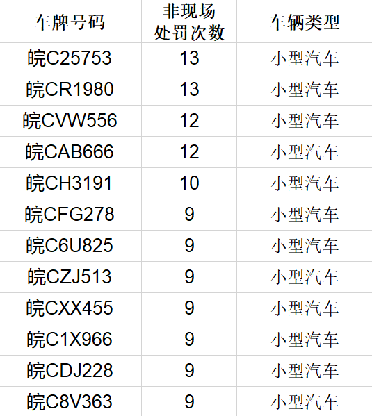 在此次曝光的交通违法车辆中,违法次数最高为13次,其中皖C25753、皖CR1980是此次曝光中违法次数最高的车辆。