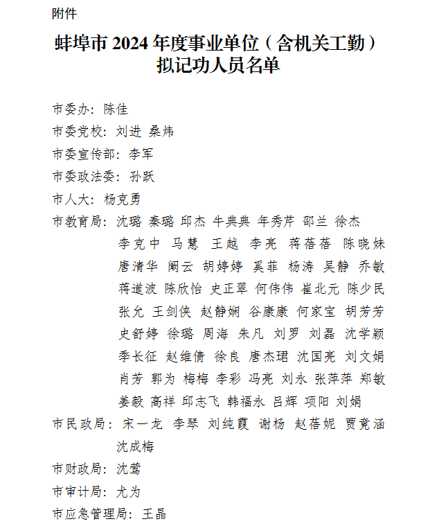 附件:蚌埠市2024年度事业单位(含机关工勤)拟记功人员名单