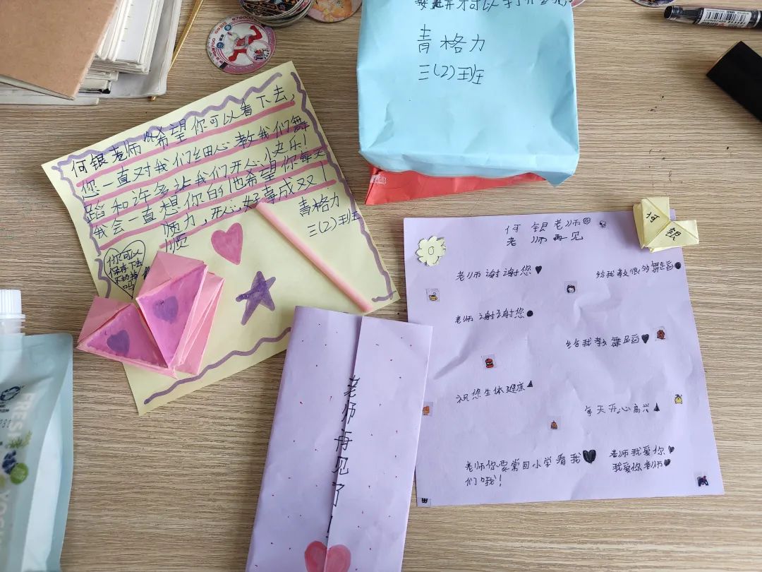 12年后的6月,何银随着支教实习团队与新疆尼勒克县科蒙乡中心小学话别时,收到了学生们用折纸做的花、爱心卡片,还有手写的信。