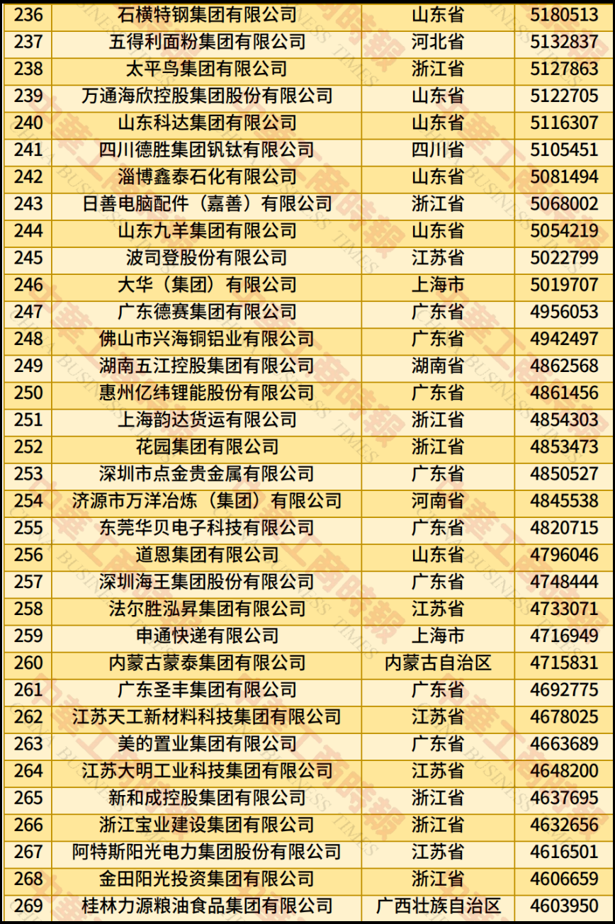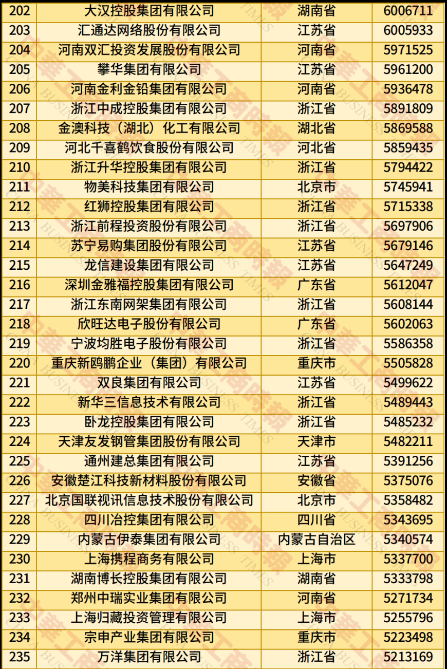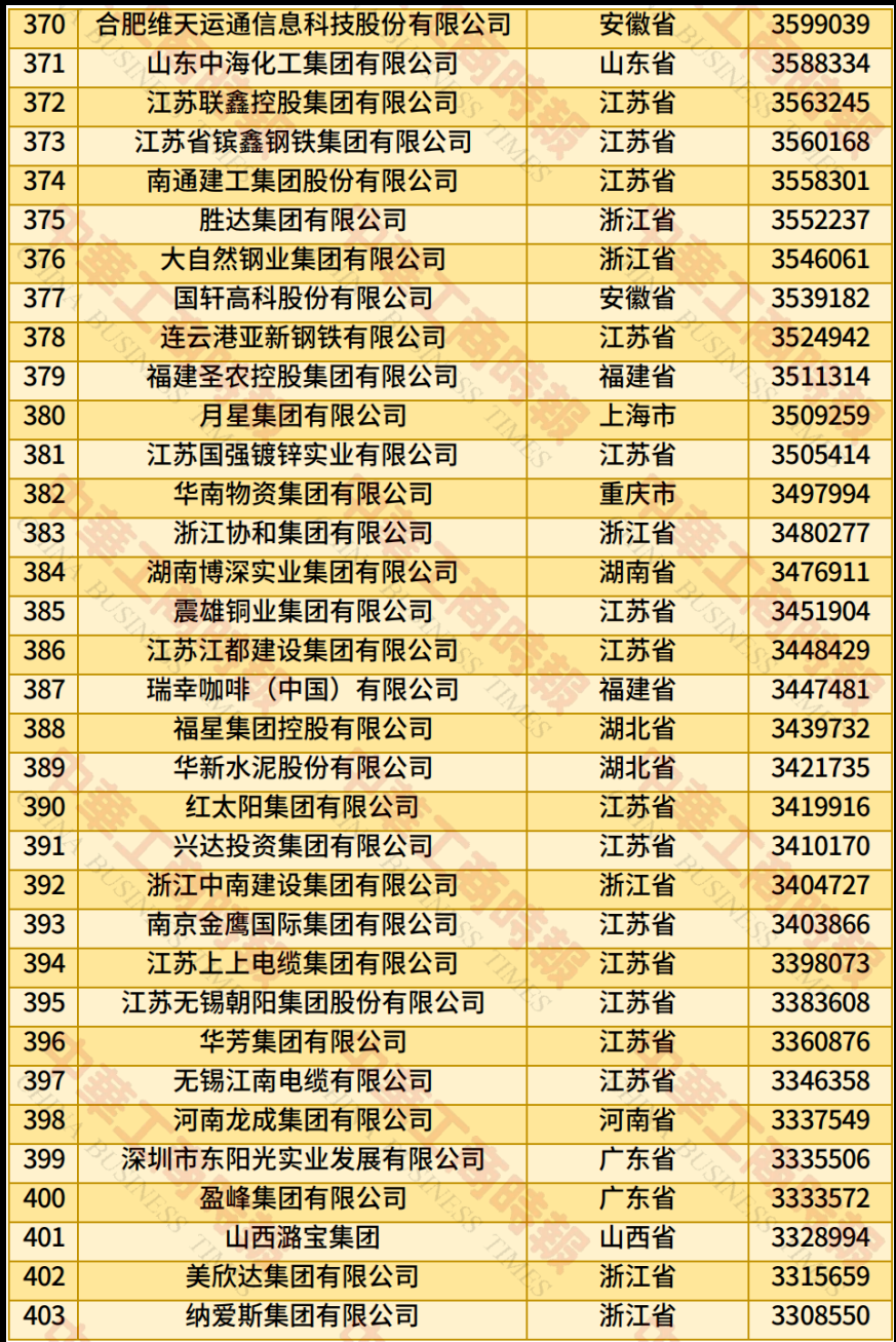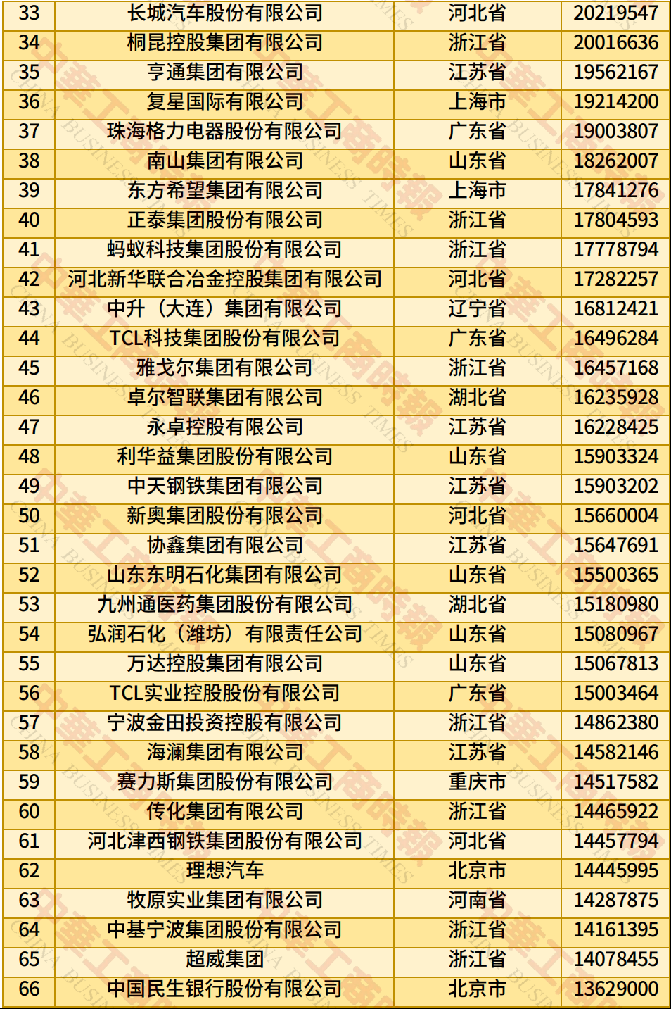 记者了解到,此次民营企业500强入围门槛增至270.23亿元;营业收入总额达到43.05万亿元;净利润合计1.80万亿元;研发费用总额1.13万亿元,研发人员总数115.17万人,平均研发经费投入强度2.77%;纳税总额达1.27万亿元,纳税额超过10亿元的企业有240家,占500强比例为48.00%。