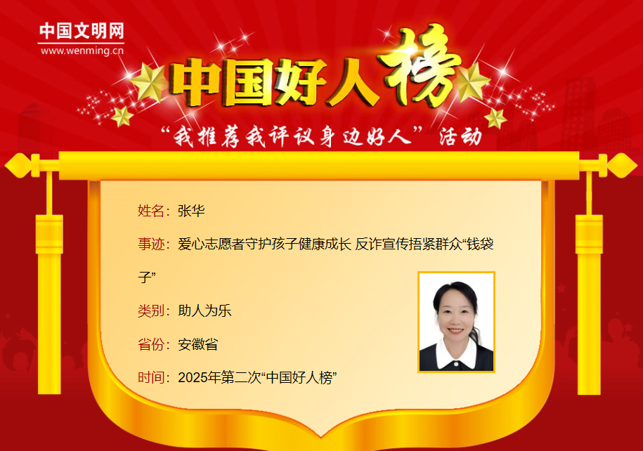 张华,女,1968年6月生,中共党员,马鞍山市当涂县超才幼儿园园长、当涂县太阳花公益协会会长。她长期致力于公益事业,发起“紫丝带”行动,深入校园开展防欺凌、防走失、防溺水等安全教育;组建“太阳花志愿服务队”,带领近百名志愿者在全县学校进行宣讲,守护儿童健康成长;积极参与反诈宣传,拍摄200余部反诈短视频,开展35场反电诈直播活动。她始终活跃在公益一线,被大家亲切地称为“华姐”。张华曾获安徽省三八红旗手等荣誉。