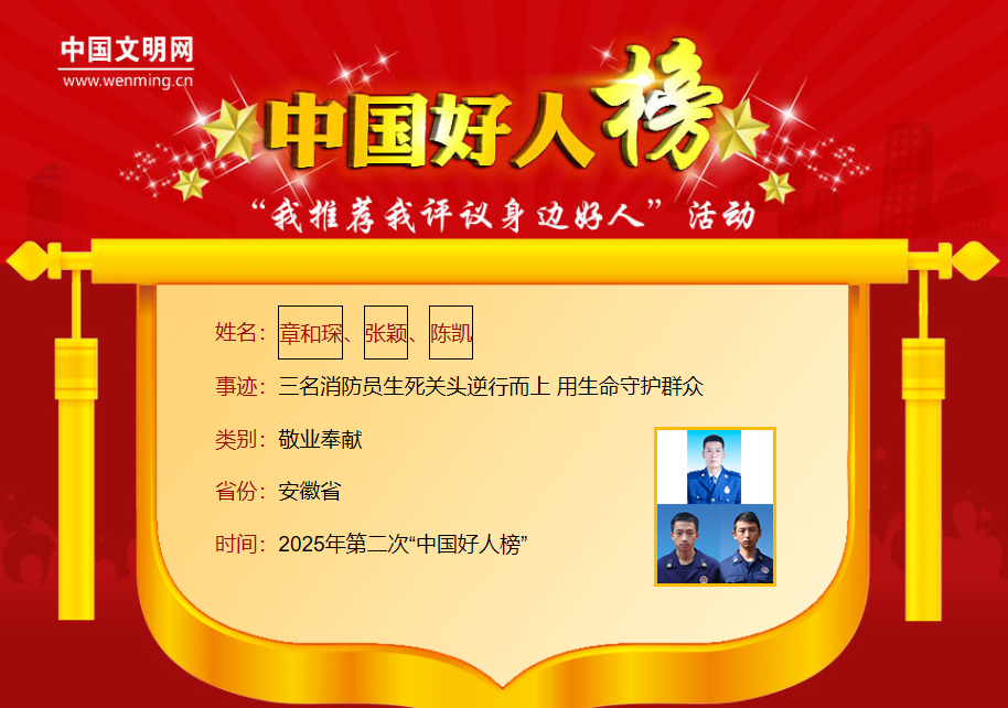 章和琛,男,1998年10月生,生前系宣城市广德市建设路消防救援站副班长。张颖,男,1998年4月生;陈凯,男,1997年2月生,二人生前均为广德市消防救援站政府专职消防队员。2025年2月17日,广德市一材料公司厂房突发火灾,3人迅速出警。面对浓烟烈火,3人始终坚守在灭火最前线,奋力堵截火势蔓延,然而风向突变、风力陡增,厂房轰燃致钢结构屋顶坍塌,章和琛、张颖、陈凯不幸被埋压,经抢救无效壮烈牺牲。三人曾获“安徽好人”等荣誉。