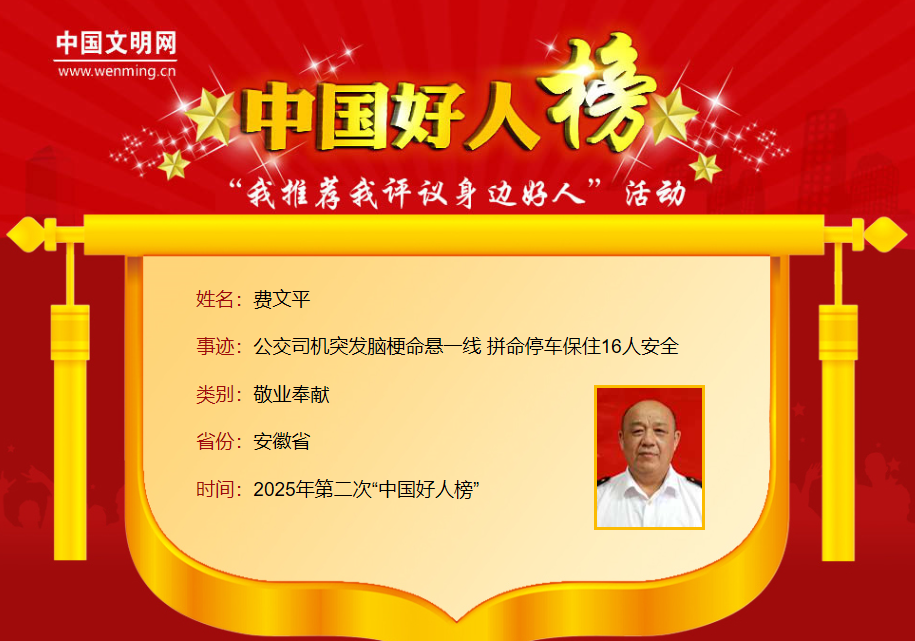 费文平,男,1965年11月生,铜陵市公交公司公交车驾驶员。2025年1月19日,费文平驾驶公交时突发脑卒中,危急时刻,他凭借顽强意志完成右转靠边、拉手刹、开车门等操作,将车稳稳停住,保住车上16名乘客生命安全。自2011年入职以来,费文平做到15年驾驶生涯零责任事故和投诉,始终认真检查车辆、热情服务乘客,耐心帮助老人、孕妇等特殊群体。