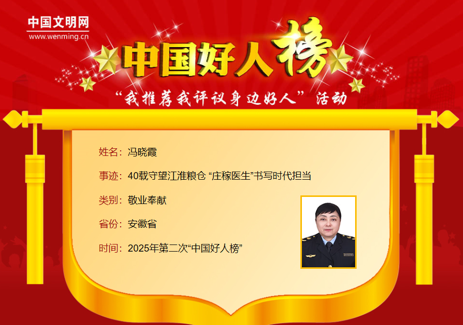 冯晓霞,女,1970年6月生,六安市霍邱县植保站站长。冯晓霞40年如一日扎根田野,主持或参与国家及省市县科技项目60余项,引领推进病虫害绿色防控与统防统治融合工作,为霍邱县跻身全国粮食生产先进县、蝉联全省总产量榜首作出重要贡献。冯晓霞曾获全国农业技术推广服务中心先进工作者、安徽省三八红旗手、“安徽好人”等荣誉。