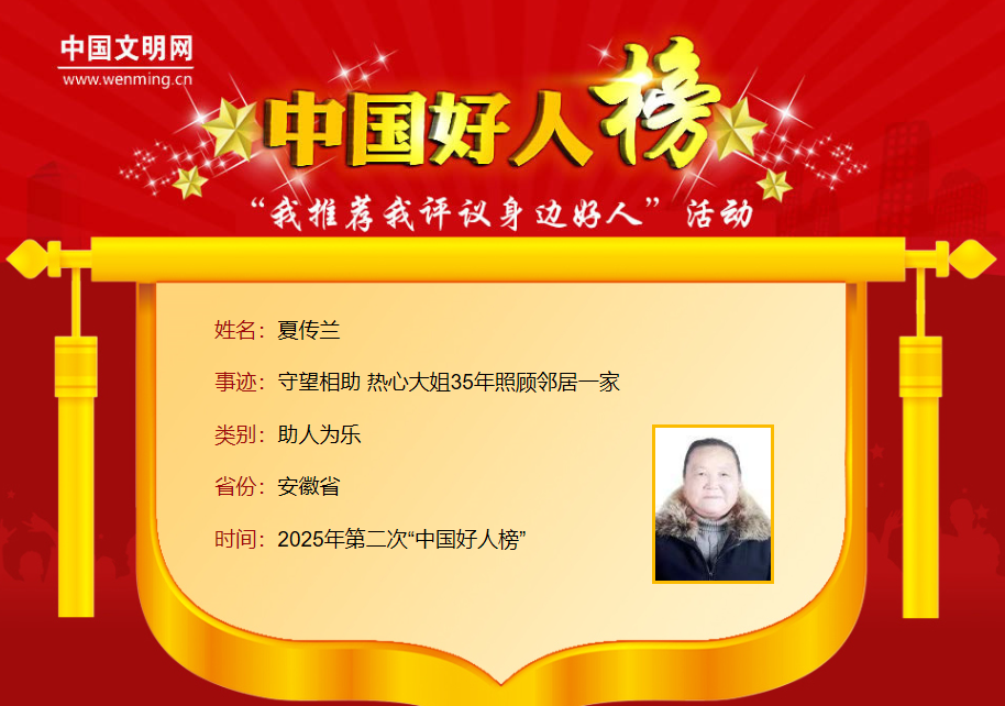 夏传兰,女,1951年7月生。芜湖市鸠江区裕溪口街道新裕路社区居民。1990年,夏传兰因热心结识了有不同程度残疾的孙茂友一家,此后便和家人开始帮扶他们。孙茂友智残儿子孙照虎伤病时,他们接其回家照料,还帮忙料理家务、介绍工作。为助孙照虎融入社会,夏传兰和家人带他参加文体活动、外出旅游。35年来,夏传兰一家用大爱为孙茂友一家撑起幸福生活。近年来,夏传兰协助街道开展“暖心帮帮团”邻里互助项目,组织邻里帮扶、孝老助困等活动160余次,惠及居民4600余人次。夏传兰曾获“安徽好人”等荣誉。